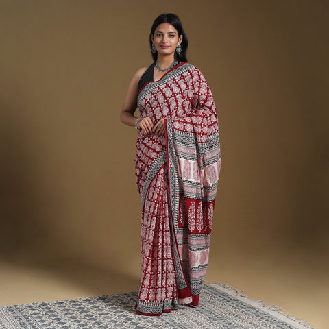 Bagh print sarees are more than just beautiful garments; they are a symbol of sustainability and ethical fashion. The use of natural dyes and eco-friendly processes reflects a deep respect for nature, a principle that is integral to the craft. The colors used in Bagh prints—deep reds, blacks, and indigos—are derived from natural sources like alizarin (from madder roots) and indigofera plants. This sustainable approach not only minimizes environmental impact but also enhances the health and well-being of the artisans, who are not exposed to harmful chemicals.
