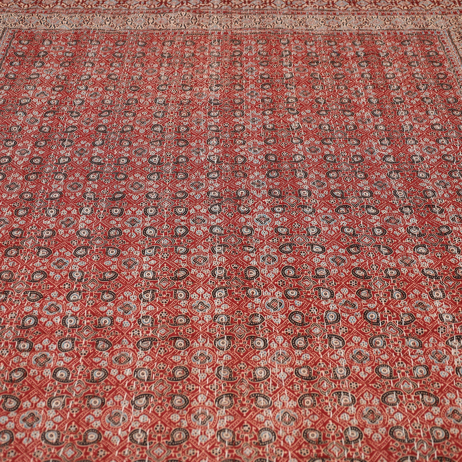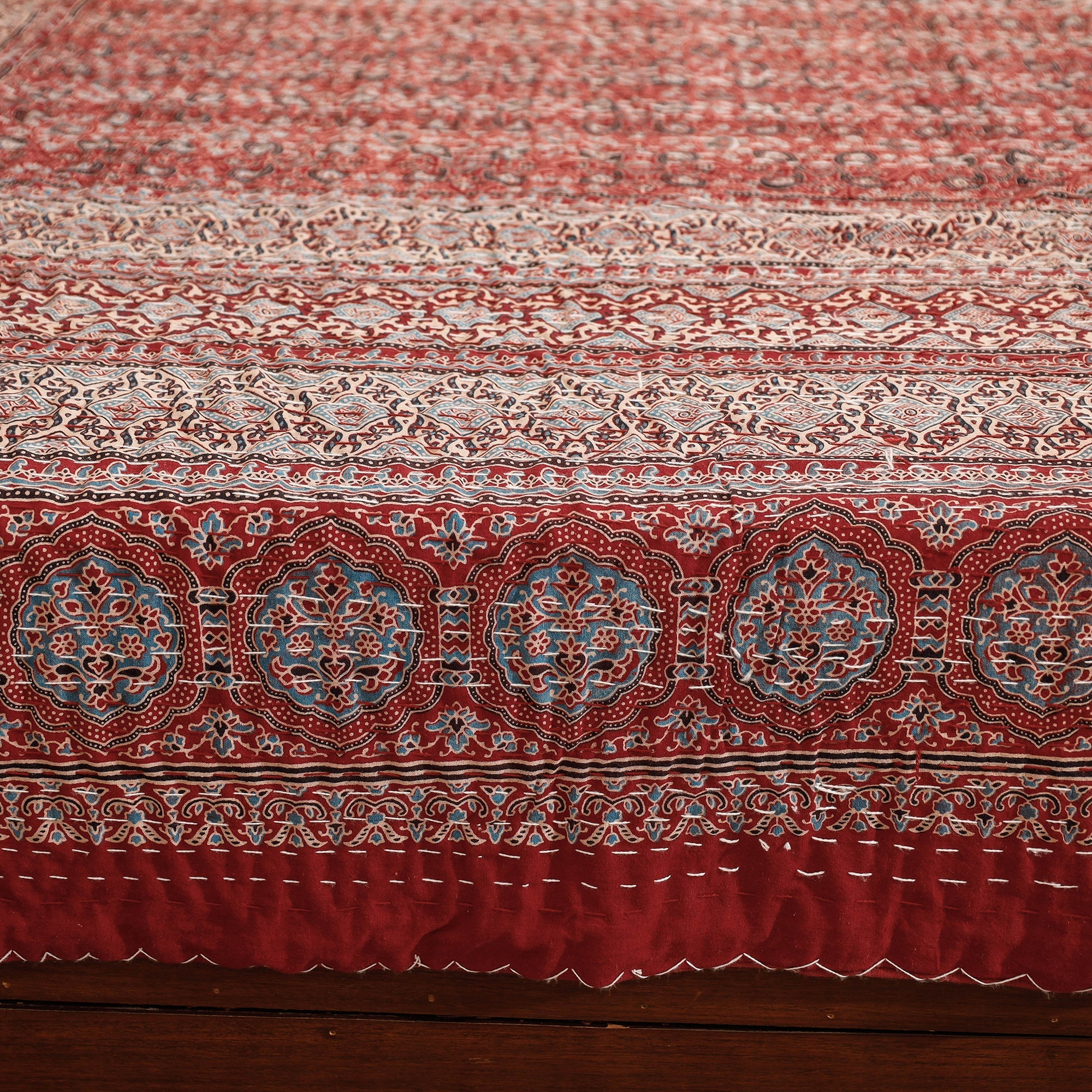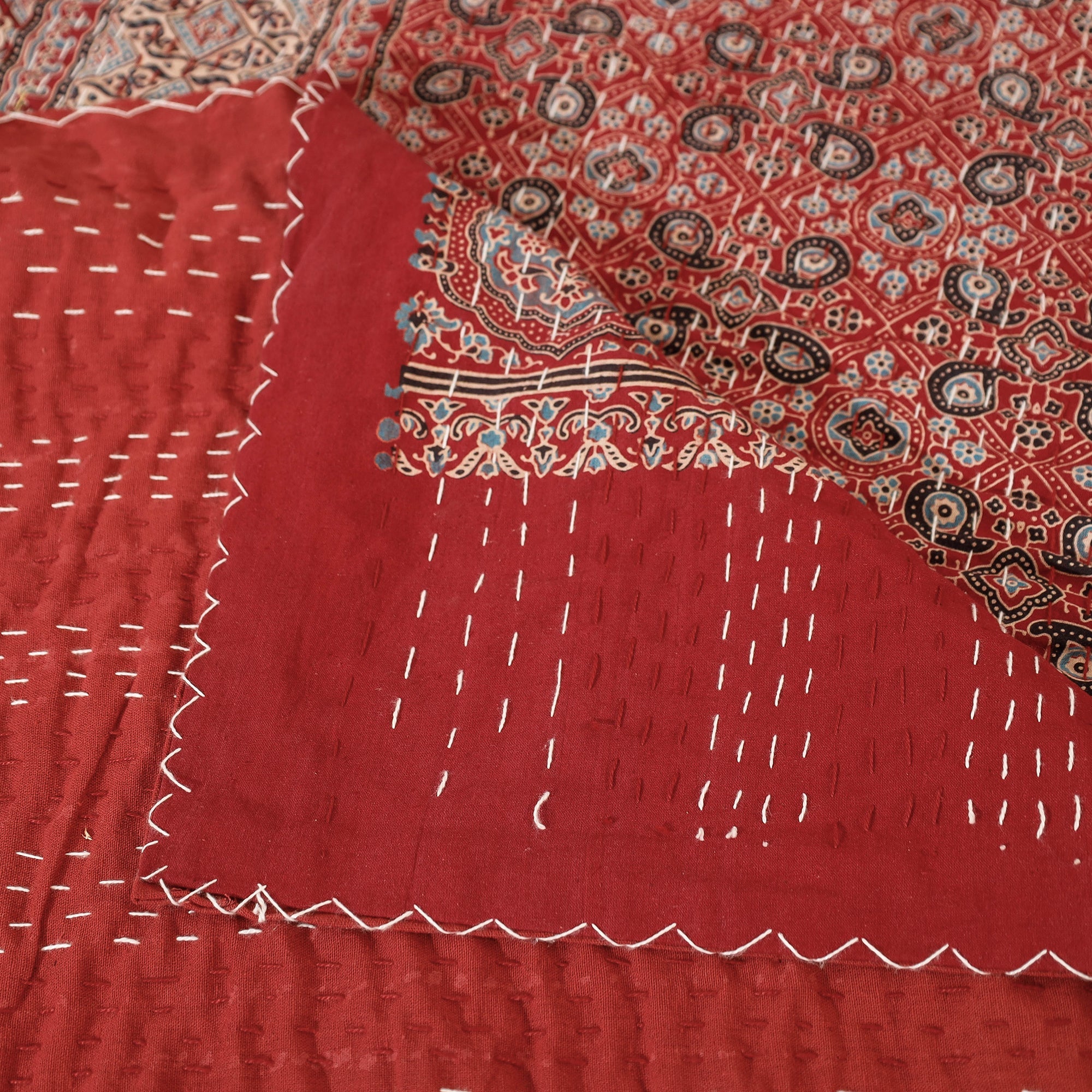 Red - Ajrakh Block Printed Kantha Work Cotton Double Bed Cover (105 x 90 in)