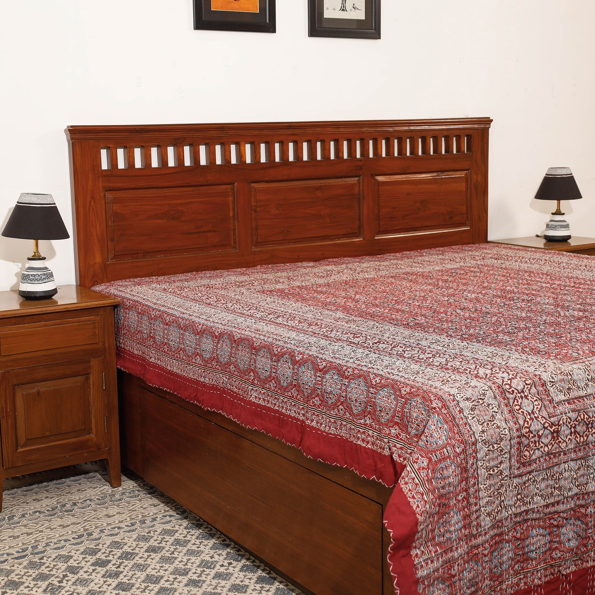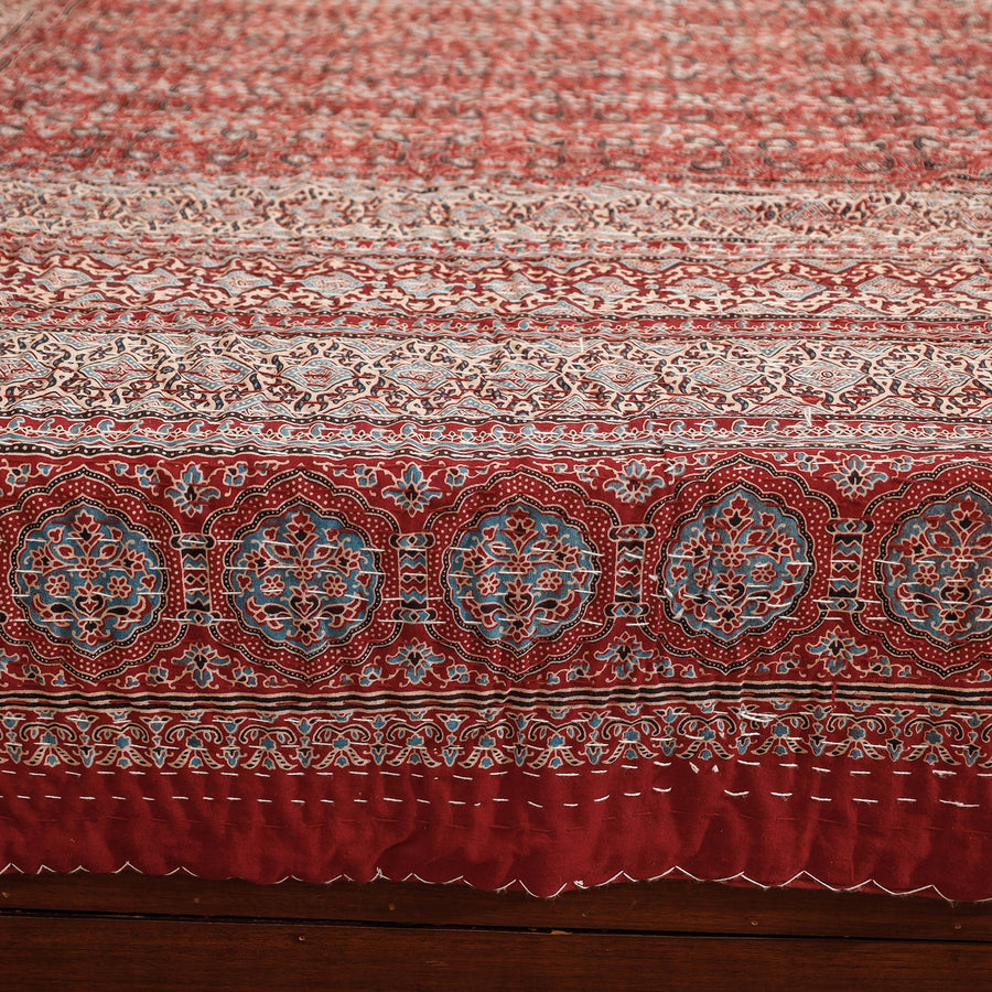 Material Fine quality ajrakh block printing double bedcover with kantha embroidery made using natural dyes through traditional process of hand block printing practised by the master artisans in Barmer, Rajasthan.