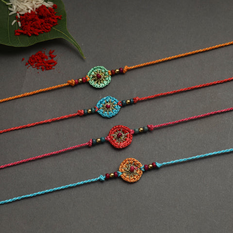Crochet is a handicraft wherein a piece of fabric with some textures is made using a hooked needle and it is called a 'crochet hook'. The pattern or texture is made by interlocking the loops of threads or yarns. Nowadays, in an effort to promote the recycling of things, many materials are used in making textures. They include old dresses, ribbons, tapes, etc. With the help of crochet, bags, purses, shawls, hats, etc. are popularly being made. In fact, crocheting has become a hobby for many people, especially homemakers. In this way, rakhi crochet is made and is very popular these days. Rakhi with cartoon characters, floral designs, and sacred symbols are being made. To decorate these, wooden beads, silk threads, cotton yards, and pieces of glass or mirrors are woven along with the crochet designs. The patterns and textures in the crochet rakhi designs are beautiful and with the wise of threads, they also look very vivid. The handmade crochet rakhi is plastic-free, handcrafted, and reusable.