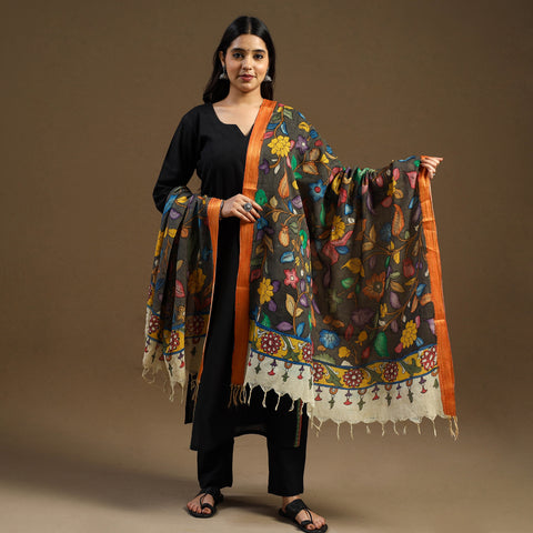 TheSrikalahasti style of Pen Kalamkariis revered for its freehand drawing, where artisans bring stories to life using vivid natural dyes. The process involves multiple stages—each piece is washed, sun-dried, treated with cow dung, and then drawn and painted by hand. This labor-intensive process takes days to complete, making every Pen Kalamkari dupatta a one-of-a-kind masterpiece.