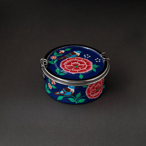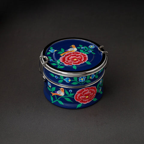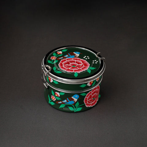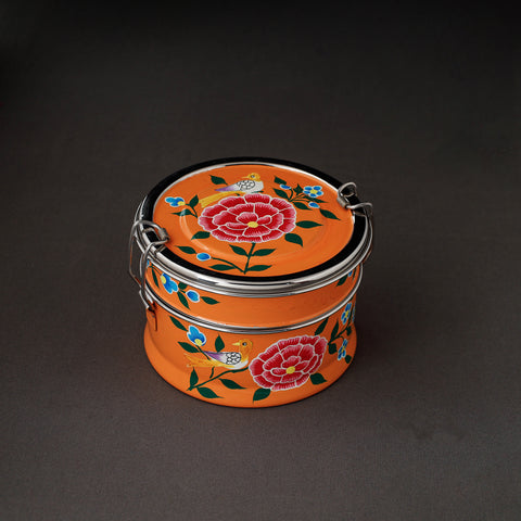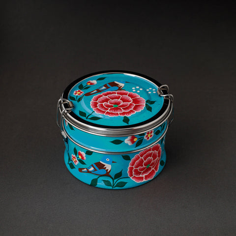 A handpainted tiffin box from iTokri features beautiful designs crafted by our team of skilled artisans from Kashmir on metalware.