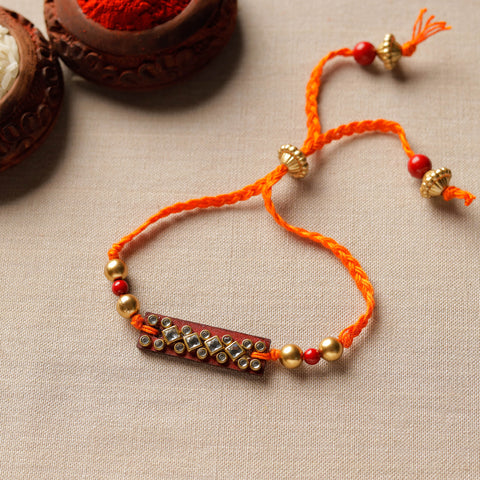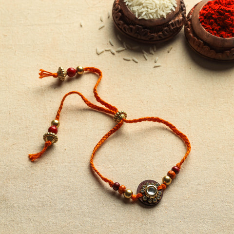 Beads made out of wood are one of the classic kinds. They give a vintage touch to the rakhi, which makes it very stylish to look. Engravings can be done manually and also by the use of technology. Technology nowadays is adding more beauty to wooden beads. The engravings can be anything, and they can be a flower, a sacred symbol like Om, Sree, Swastik, some god's figure, or even your brother's name. Engravings are being done to the wooden beads to enhance their look. By using technology, sometimes the wooden beads can be polished and made to look shiny, which is almost similar to the glossiness of any gemstone or glass. The wooden beads can then be attached to a suitable thread and be transformed into a fashionable rakhi. Another unique thing about a Wooden engraving Rakhi is that the colour of the wood is natural. Different kinds of woods have different shades of colour. Hence, the colour adds elegance to the rakhi, checks out hand-carved rakhi online, Wooden engraving Rakhi and surprises your sibling.