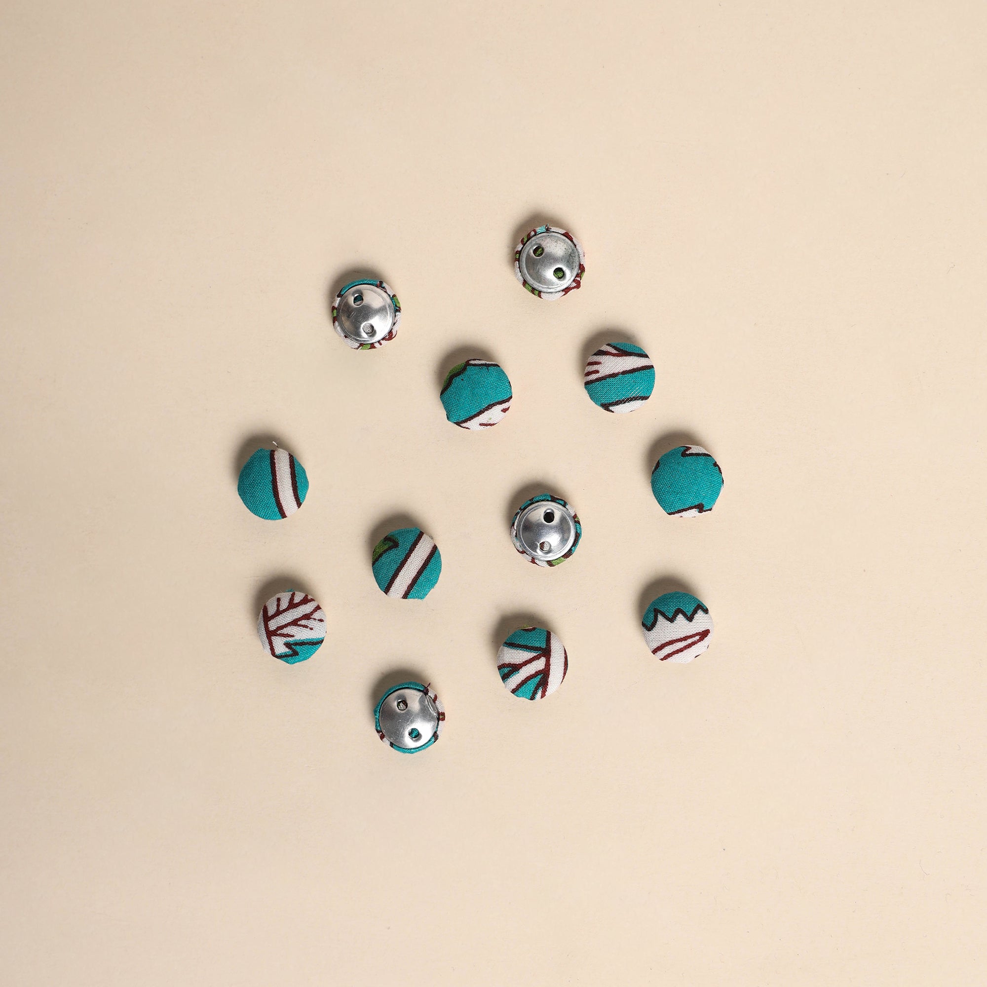 Enhance your creative projects with this set of 12 handmade fabric buttons by Buttonbaaz. Crafted from cotton fabric and fitted with rust free aluminum bases, these buttons are perfect for sewing, knitting, crochet, scrapbooking, and other DIY crafts, adding a handcrafted charm to every design.