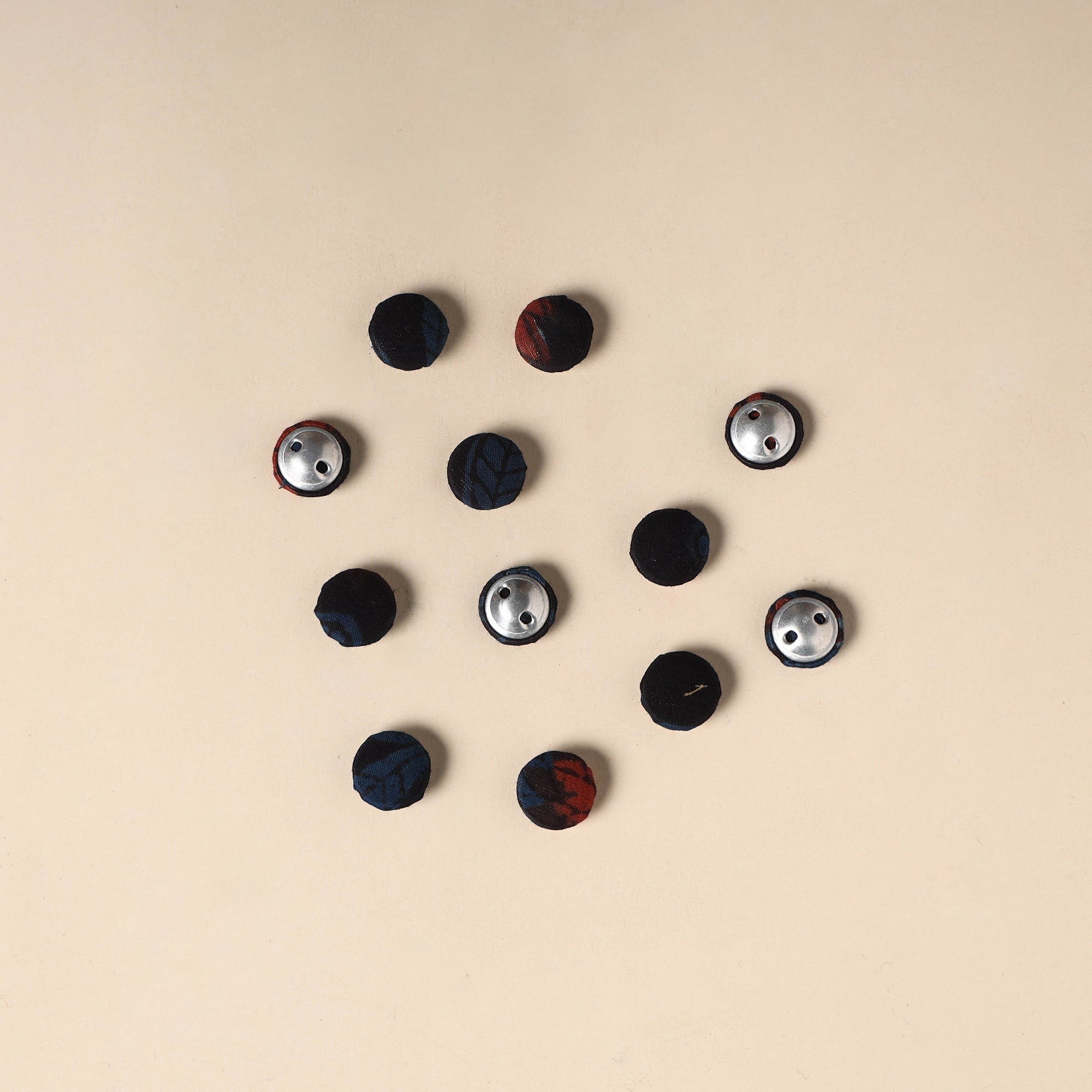 Enhance your creative projects with this set of 12 handmade fabric buttons by Buttonbaaz. Crafted from cotton fabric and fitted with rust free aluminum bases, these buttons are perfect for sewing, knitting, crochet, scrapbooking, and other DIY crafts, adding a handcrafted charm to every design.