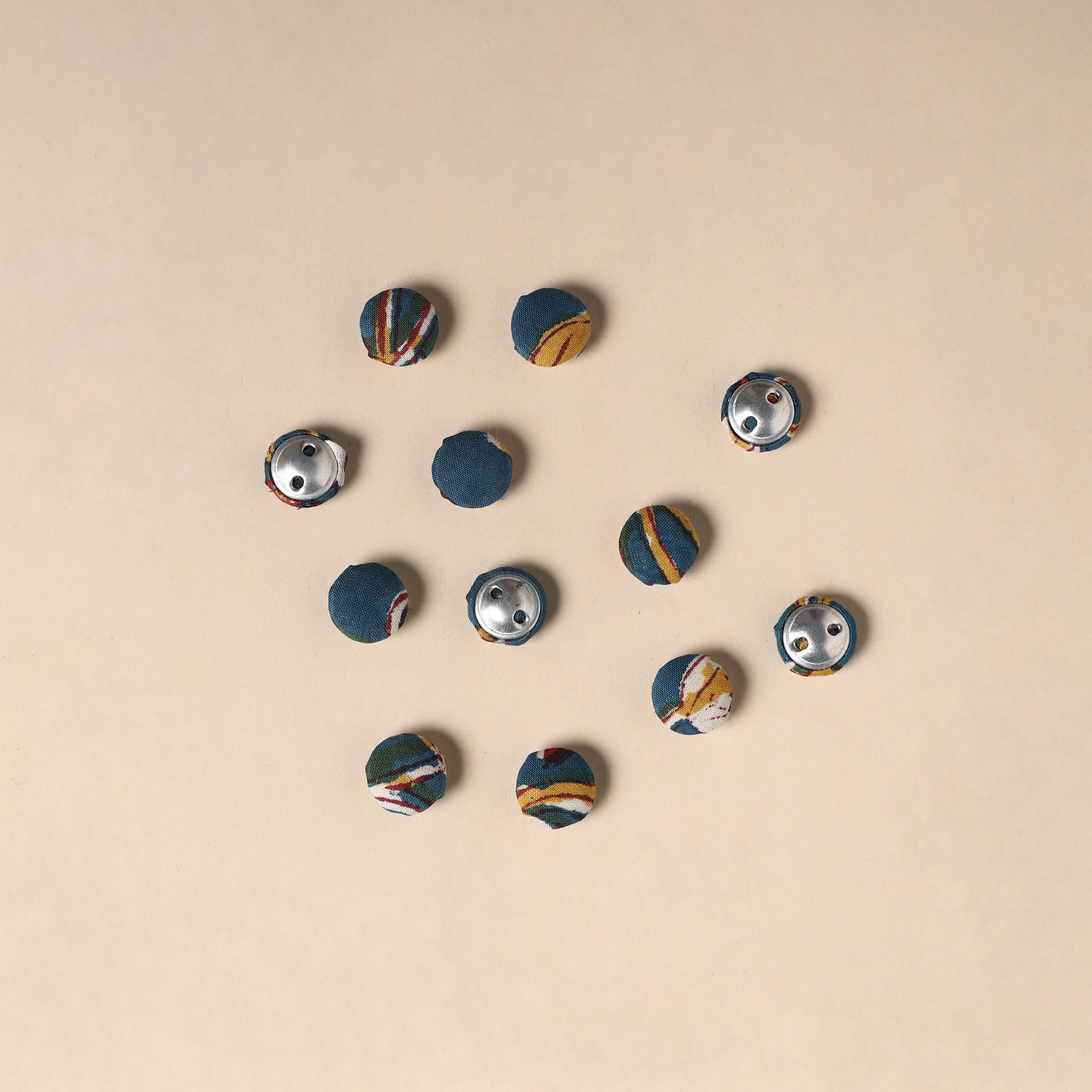 Enhance your creative projects with this set of 12 handmade fabric buttons by Buttonbaaz. Crafted from cotton fabric and fitted with rust free aluminum bases, these buttons are perfect for sewing, knitting, crochet, scrapbooking, and other DIY crafts, adding a handcrafted charm to every design.