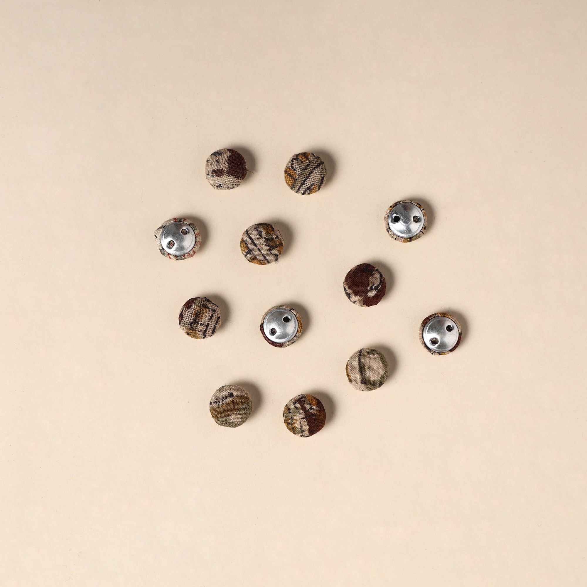 Enhance your creative projects with this set of 12 handmade fabric buttons by Buttonbaaz. Crafted from cotton fabric and fitted with rust free aluminum bases, these buttons are perfect for sewing, knitting, crochet, scrapbooking, and other DIY crafts, adding a handcrafted charm to every design.