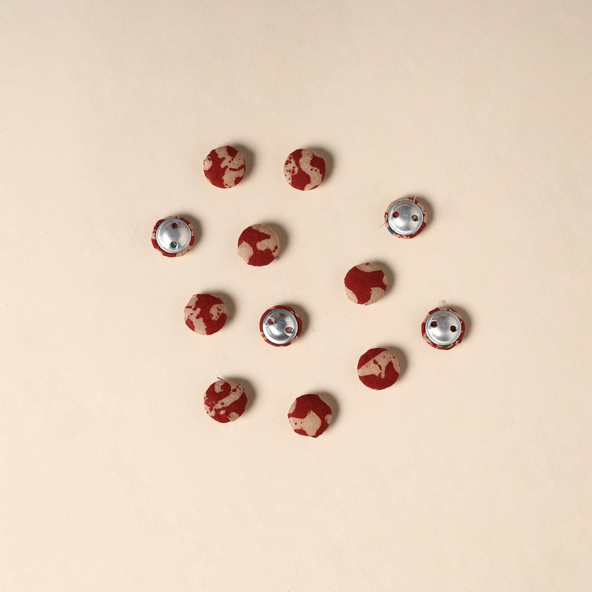 Enhance your creative projects with this set of 12 handmade fabric buttons by Buttonbaaz. Crafted from cotton fabric and fitted with rust free aluminum bases, these buttons are perfect for sewing, knitting, crochet, scrapbooking, and other DIY crafts, adding a handcrafted charm to every design.