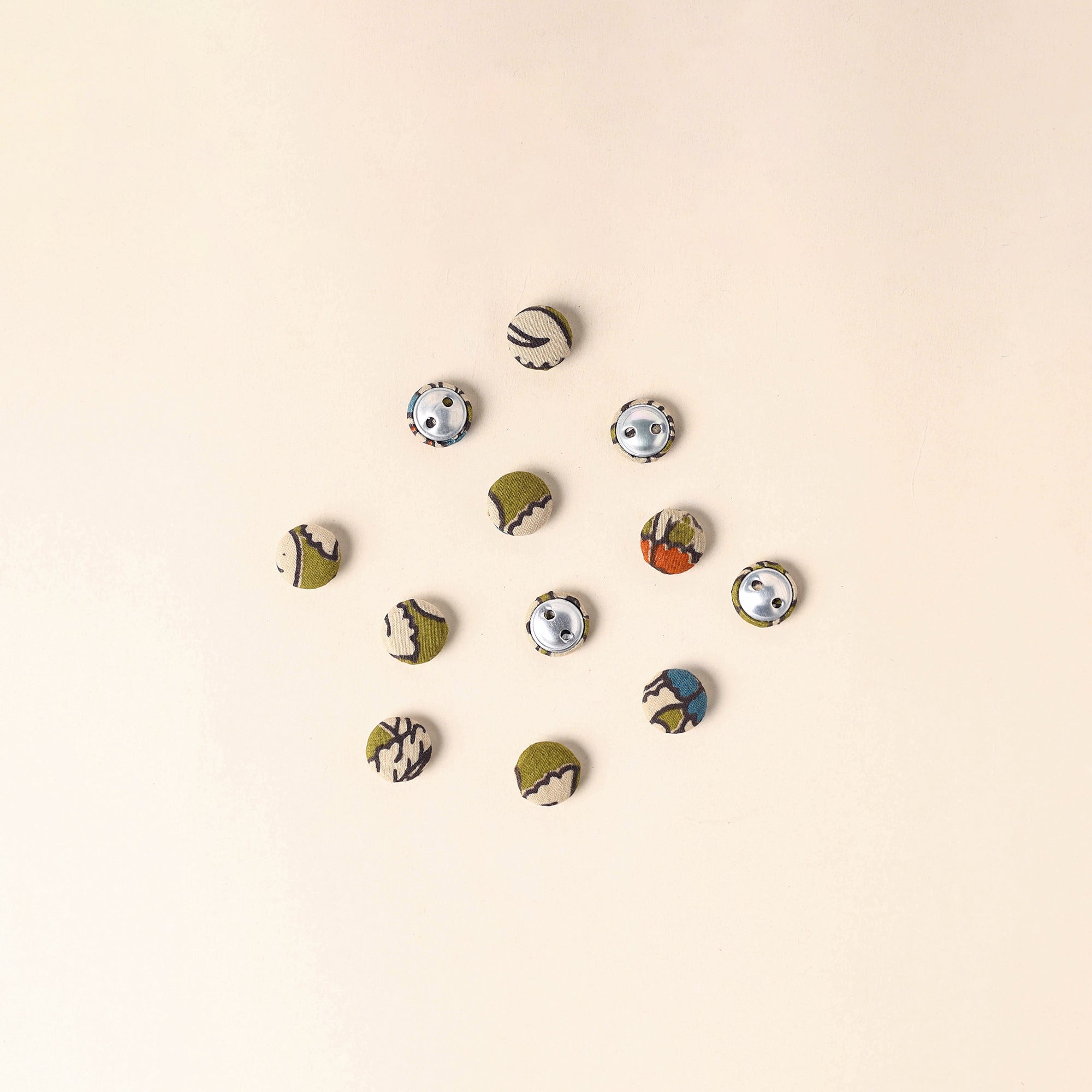 Bring a handmade charm to your creations with this set of 12 green fabric buttons. Each button is lovingly crafted by skilled artisans using soft cotton and durable, rust-free aluminum bases. Whether you're passionate about sewing, crochet, embroidery, or scrapbooking, these buttons add a unique, handmade detail to every project. Discover the fusion of traditional craftsmanship and minimalist design.