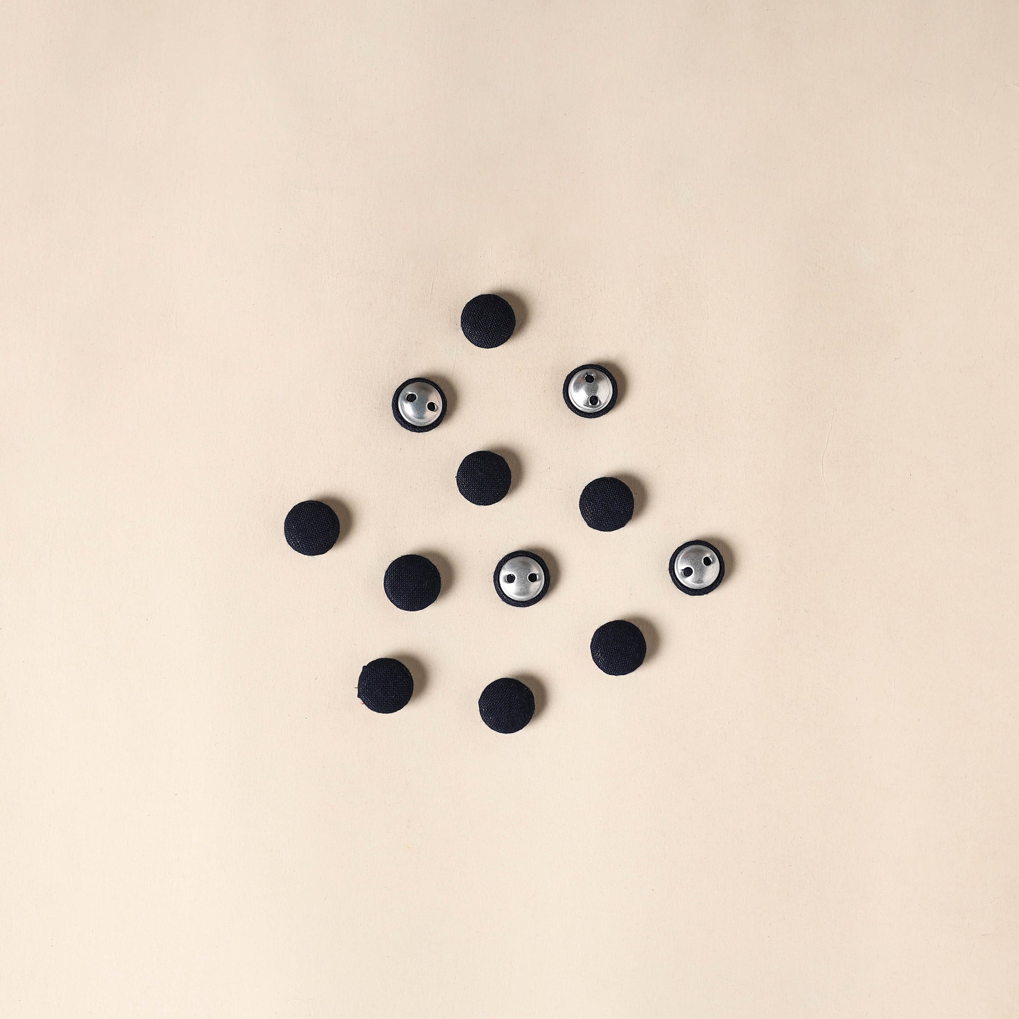 Bring a handmade charm to your creations with this set of 12 black fabric buttons. Each button is lovingly crafted by skilled artisans using soft cotton and durable, rust-free aluminum bases. Whether you're passionate about sewing, crochet, embroidery, or scrapbooking, these buttons add a unique, handmade detail to every project. Discover the fusion of traditional craftsmanship and minimalist design.