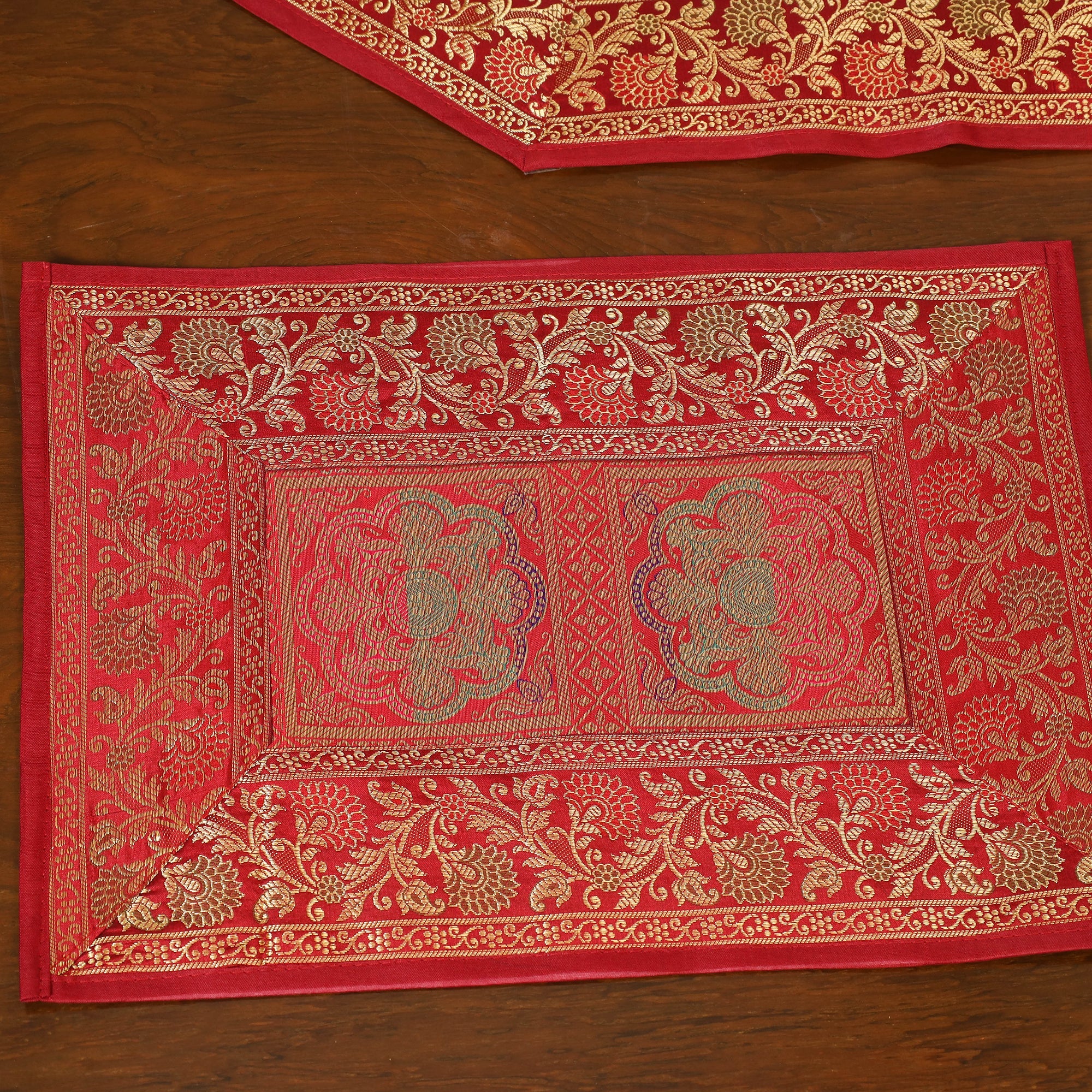 Bring home the charm of Banaras with this red banarasi dining table runner set. Crafted from viscose silk by skilled artisans, it features detailed zari paisley motifs that lend a royal touch to your dining space. The 13piece set includes one table runner with zari tassels on both sides, six mats, and six coasters, making it practical as well as stylish. Perfect for festive dinners or everyday use, this dining table runner highlights India’s rich weaving tradition.