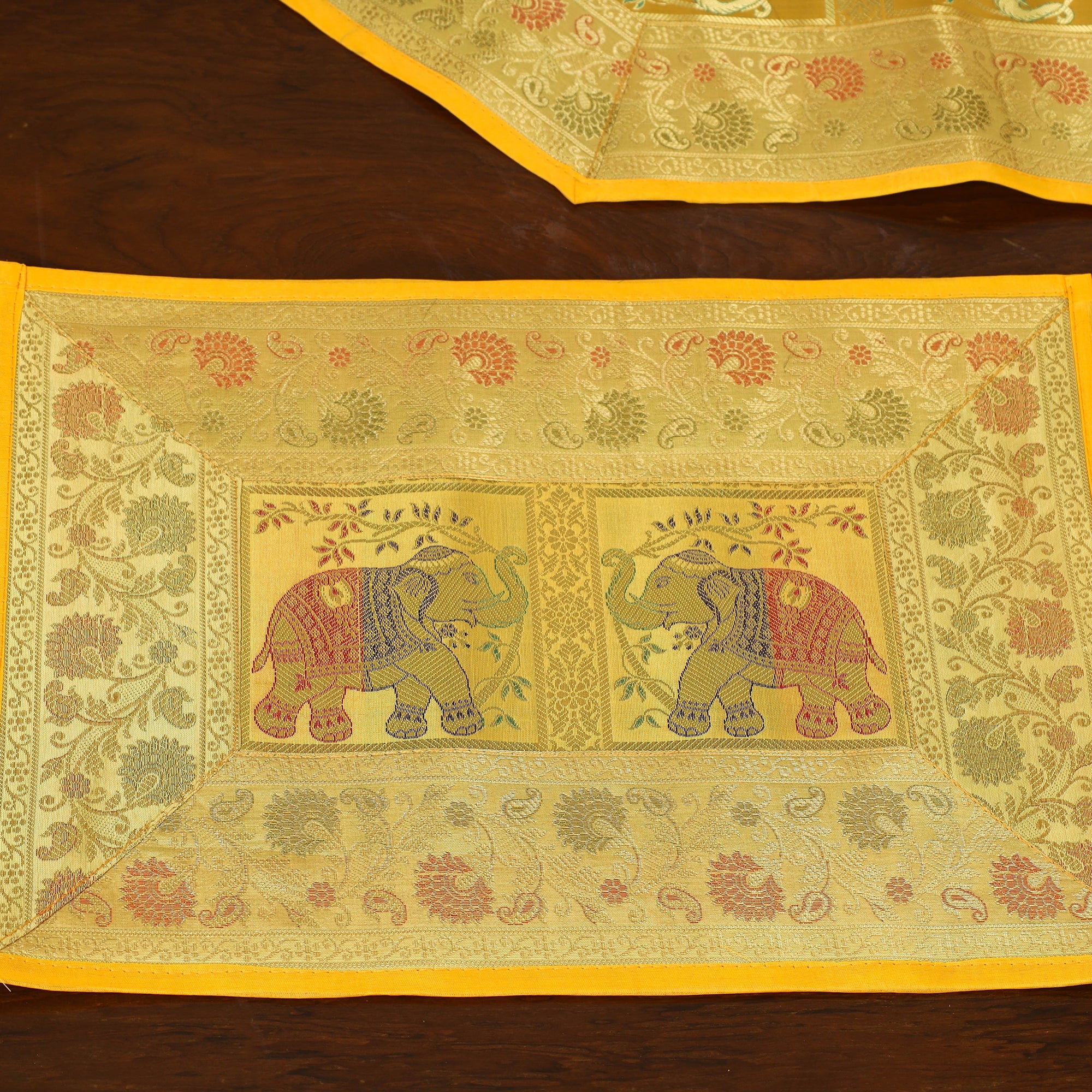 Bring home the charm of Banaras with this yellow banarasi dining table runner set. Crafted from viscose silk by skilled artisans, it features detailed zari paisley motifs that lend a royal touch to your dining space. The 13piece set includes one table runner with zari tassels on both sides, six mats, and six coasters, making it practical as well as stylish. Perfect for festive dinners or everyday use, this dining table runner highlights India’s rich weaving tradition.
