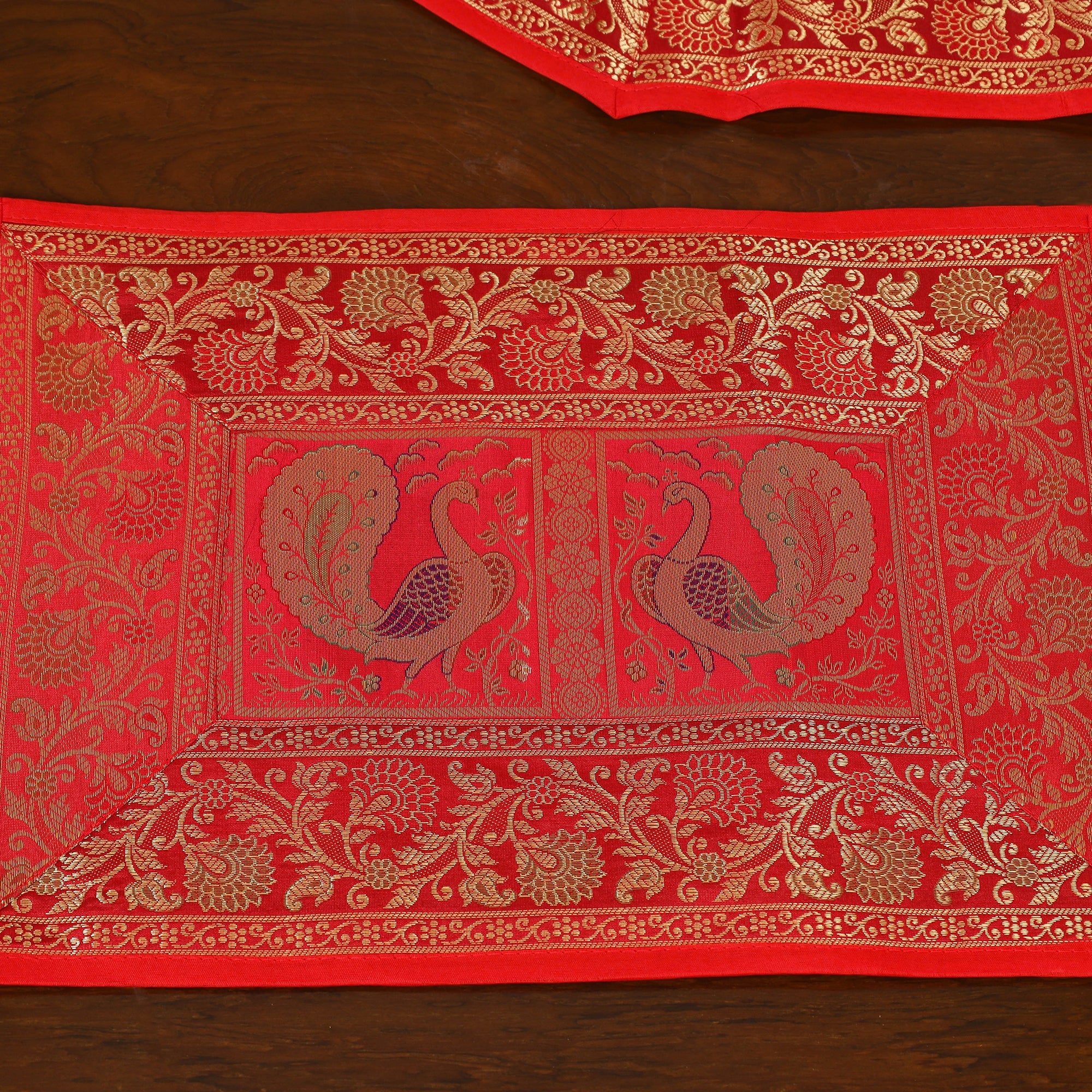 Bring home the charm of Banaras with this red banarasi dining table runner set. Crafted from viscose silk by skilled artisans, it features detailed zari paisley motifs that lend a royal touch to your dining space. The 13piece set includes one table runner with zari tassels on both sides, six mats, and six coasters, making it practical as well as stylish. Perfect for festive dinners or everyday use, this dining table runner highlights India’s rich weaving tradition.
