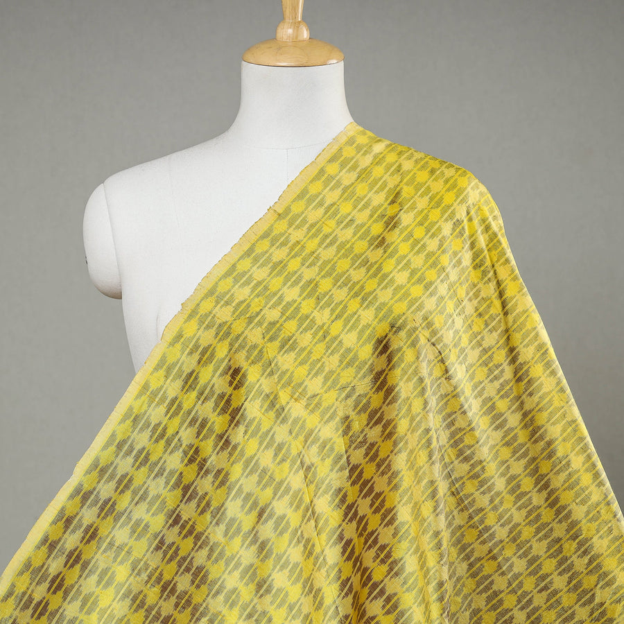 Finest pure handwoven vivid yellow butti's on straight line design pochampally double ikat raw silk fabric from Andhra Pradesh. Ikat (Ikkat) is a dyeing technique used to pattern textiles that employs a resist dyeing process similar to tie-dye on either the warp or weft fibers prior to dyeing. Ikat has lovely patterns in extremely beautiful colours. Ikat fabrics are world famous for their colours, texture and designs. Indian Ikat is one of the fabrics that is always admired by the fashion designers around the world. A masterful craftsmanship by the national award winner Padmashree Gajam Govardhana. This piece carries tiny knots, thread pulls, or uneven lines — not flaws, but fingerprints. Every irregularity is a whisper from the hands that made it. It’s what happens when tradition weaves through time, not machines. If you’re looking for perfection, this isn’t it. But if you’re looking for soul — you’ve found it.