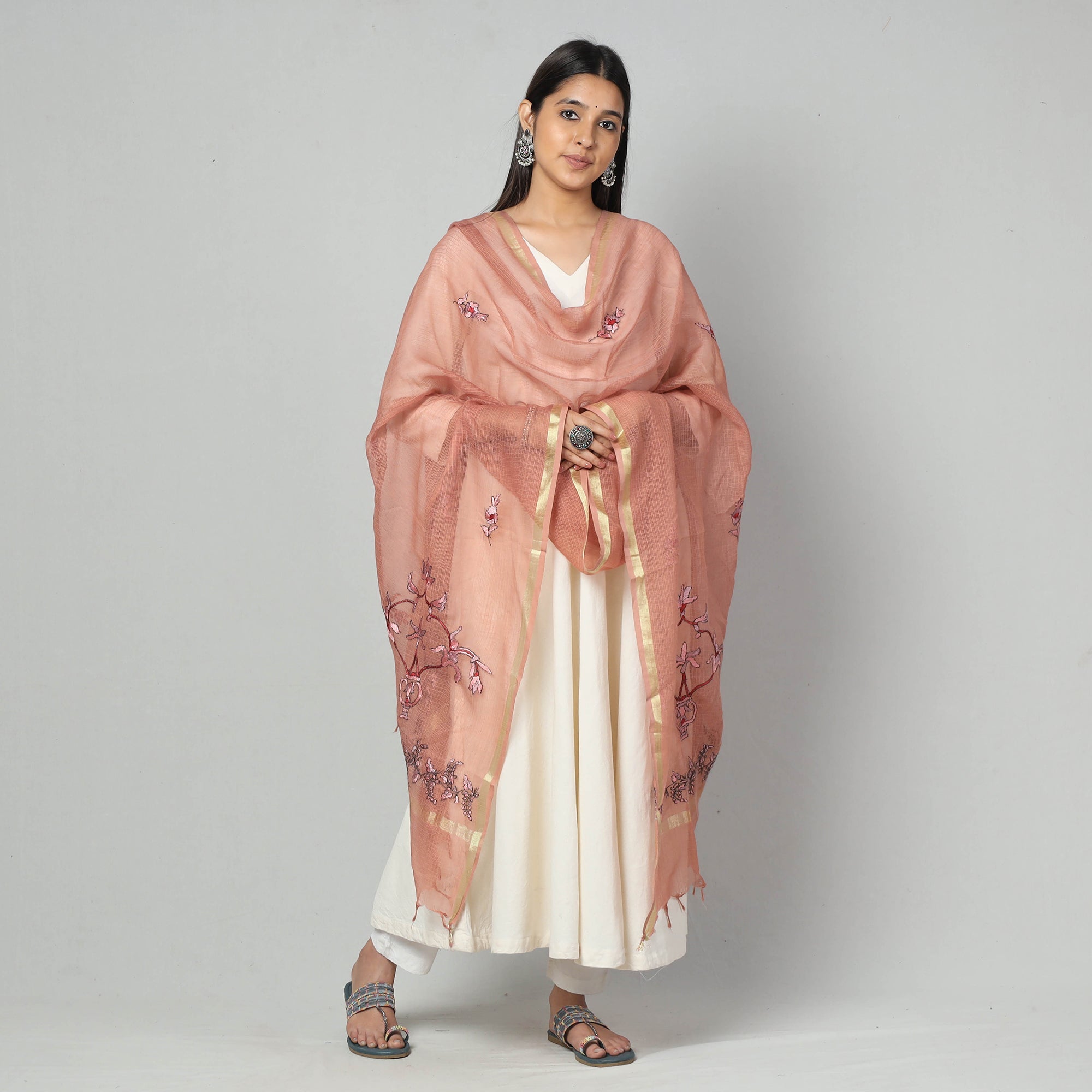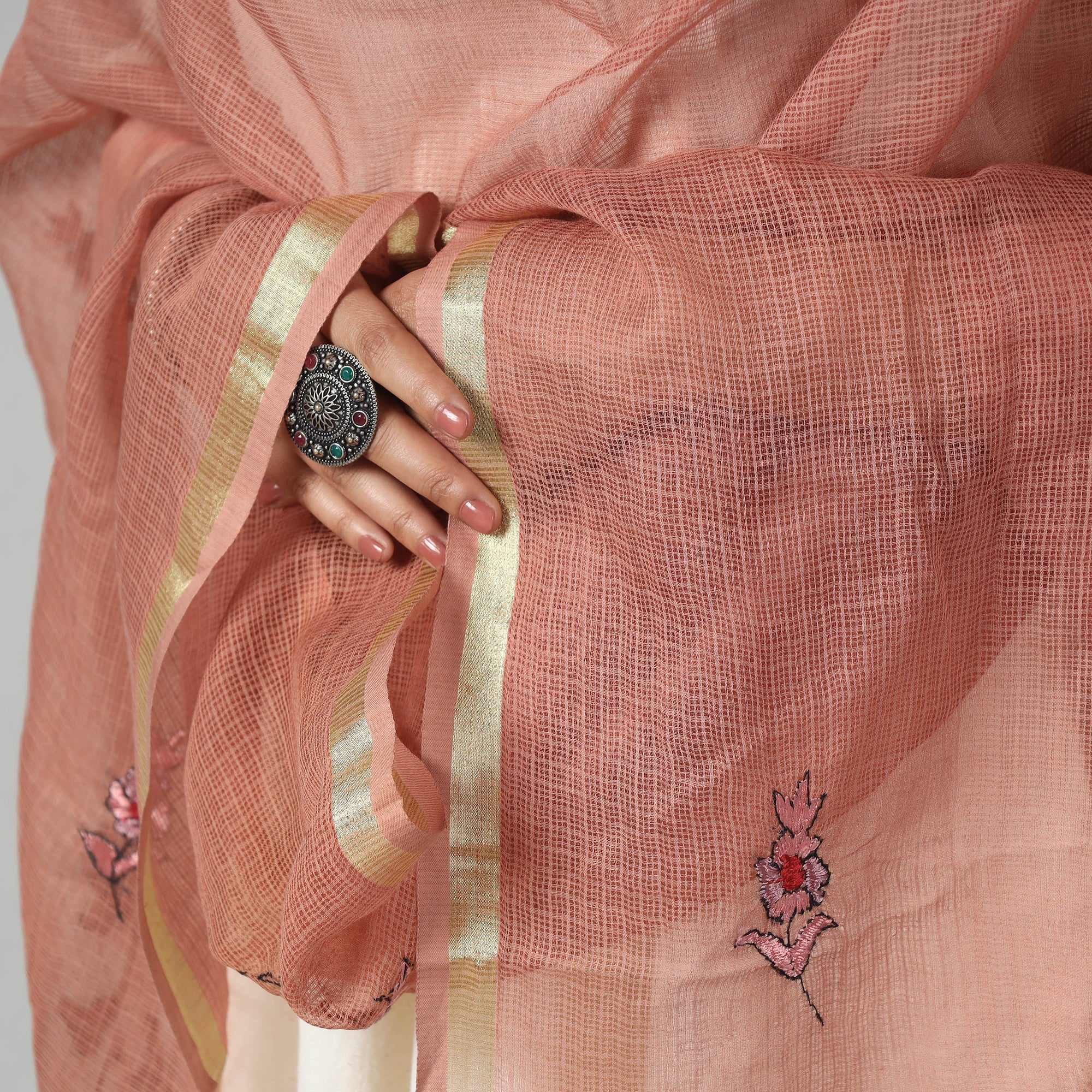 Fine kashida thread work hand embroidery on kota silk dupatta by Zahoor Ahmed from Harwan, Kashmir.