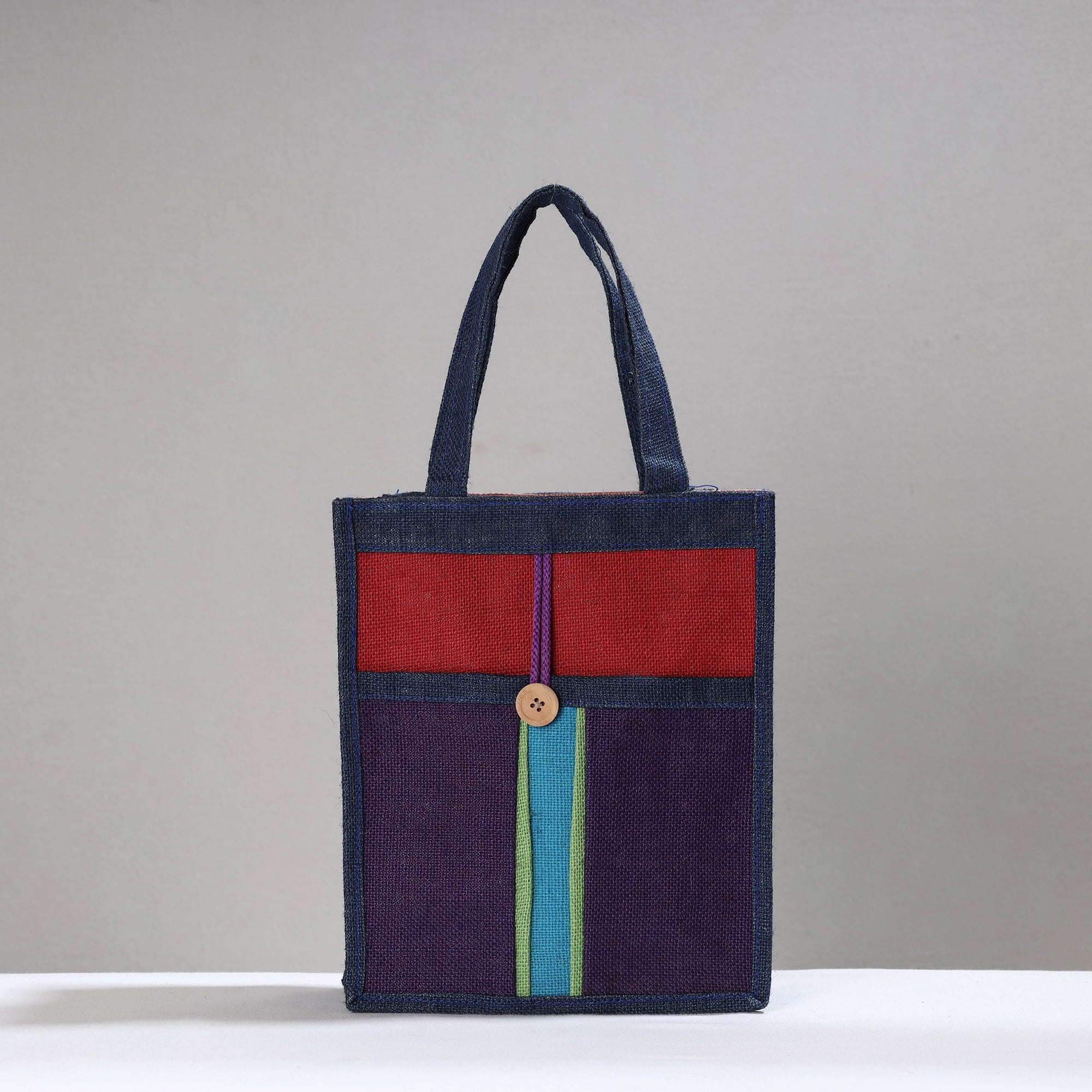 Blue handcrafted multipurpose jute hand bag made of jute by Santosh Kumar from Nainital, Uttarakhand. It has laminated layer lining inside for extra strength & water resistance and has one pocket on front side with button closure.