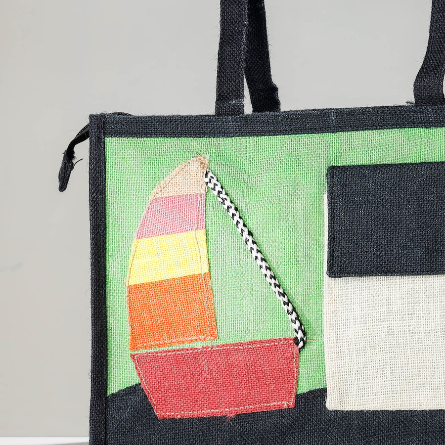 Green handcrafted multipurpose jute hand bag made of jute by Santosh Kumar from Nainital, Uttarakhand.It has laminated layer lining inside for extra strength & water resistance and has one pocket outside with magnetic snap button closure.