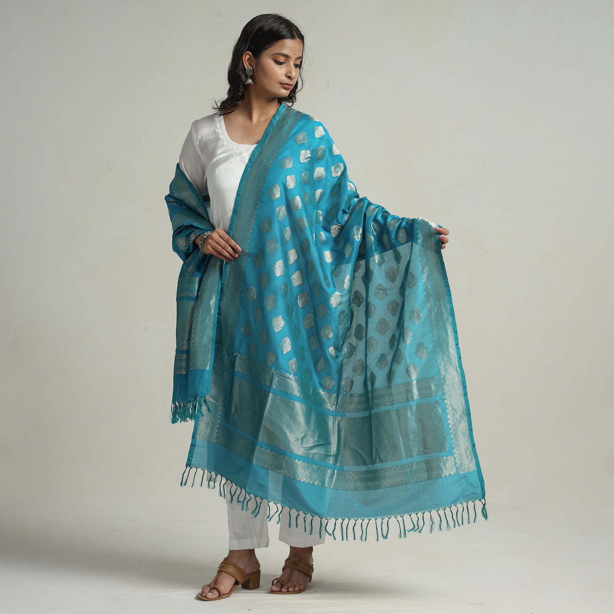 Fine quality traditional pure banarasi handwoven katan silk gold & silver zari meena buti dupatta. Katan Silk is one of the finest varieties of Silk. It is created by twisting 2-filaments together to create a sturdier and more durable fabric. This collection of finest pure and handwoven banarasi dupattas from Banaras are going to be a beautiful addition to your wardrobe in vibrant jewel tones, the dupatta have intricately woven motifs. Soft texture.