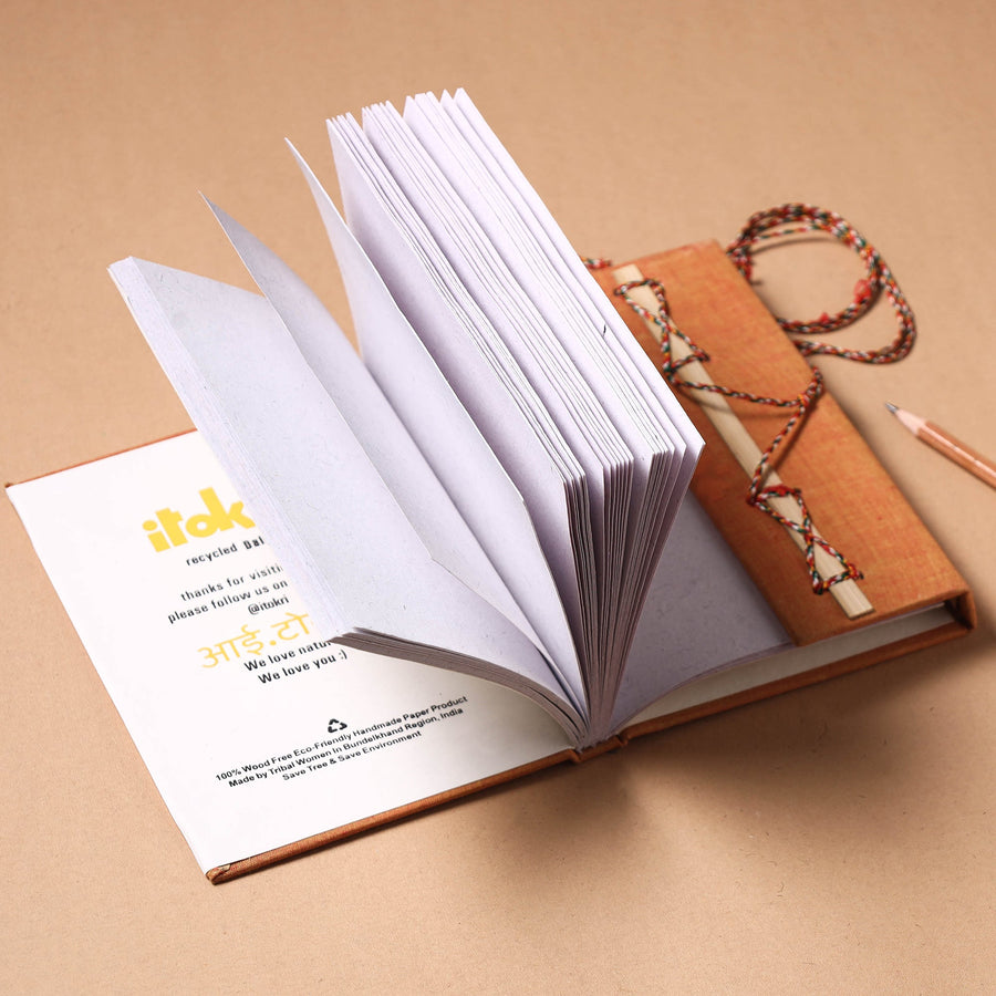 | Material | Fabric embellished hard bound cover thread lock notebook with handmade papers. This paper is made of cotton, paper and other natural fibre waste recycled in an eco-friendly manner without the use of chemicals. Hand made by master artisans who maintain careful personal attention to detail. They are highly skilled in a variety of bookbinding and handmade stationery manufacturing techniques. |