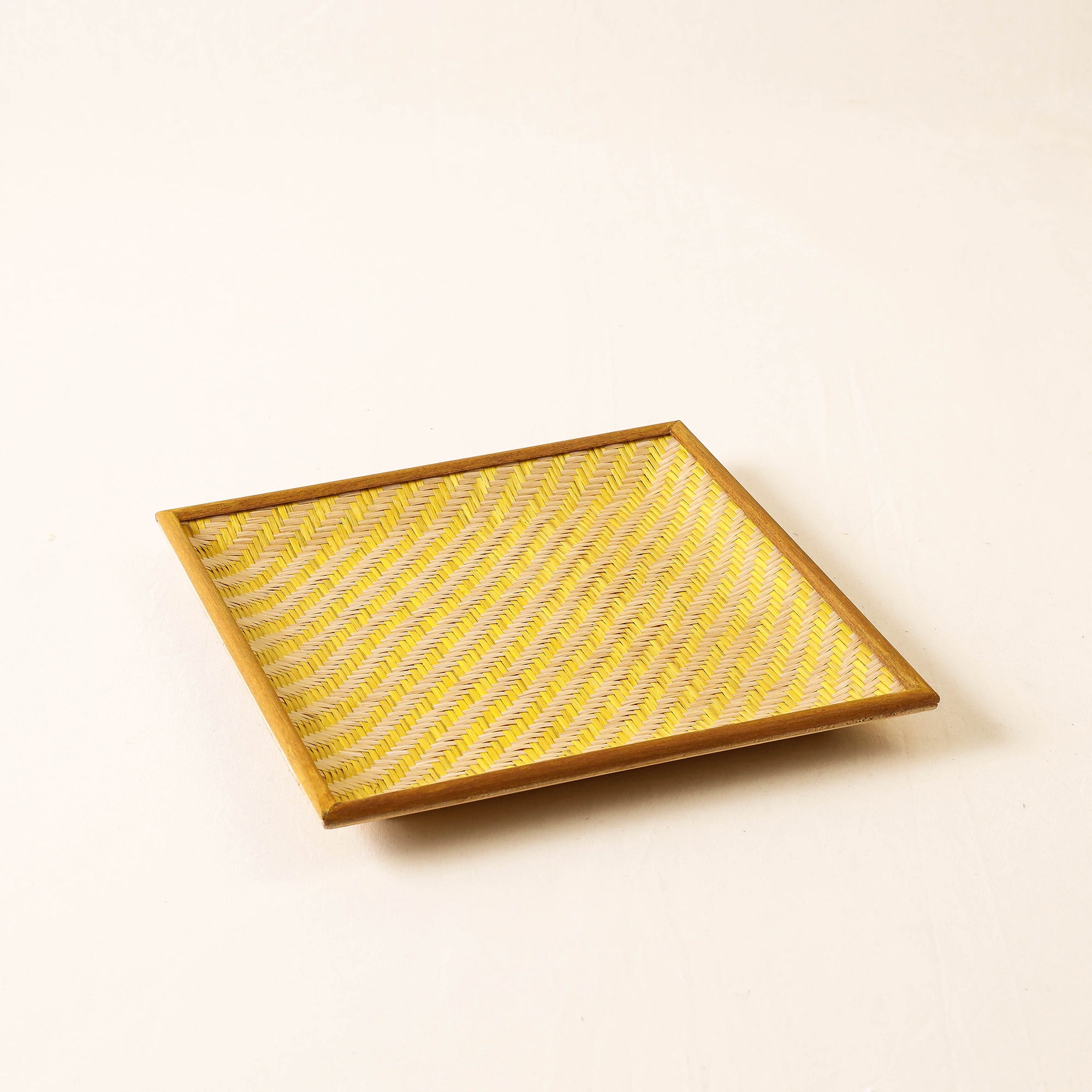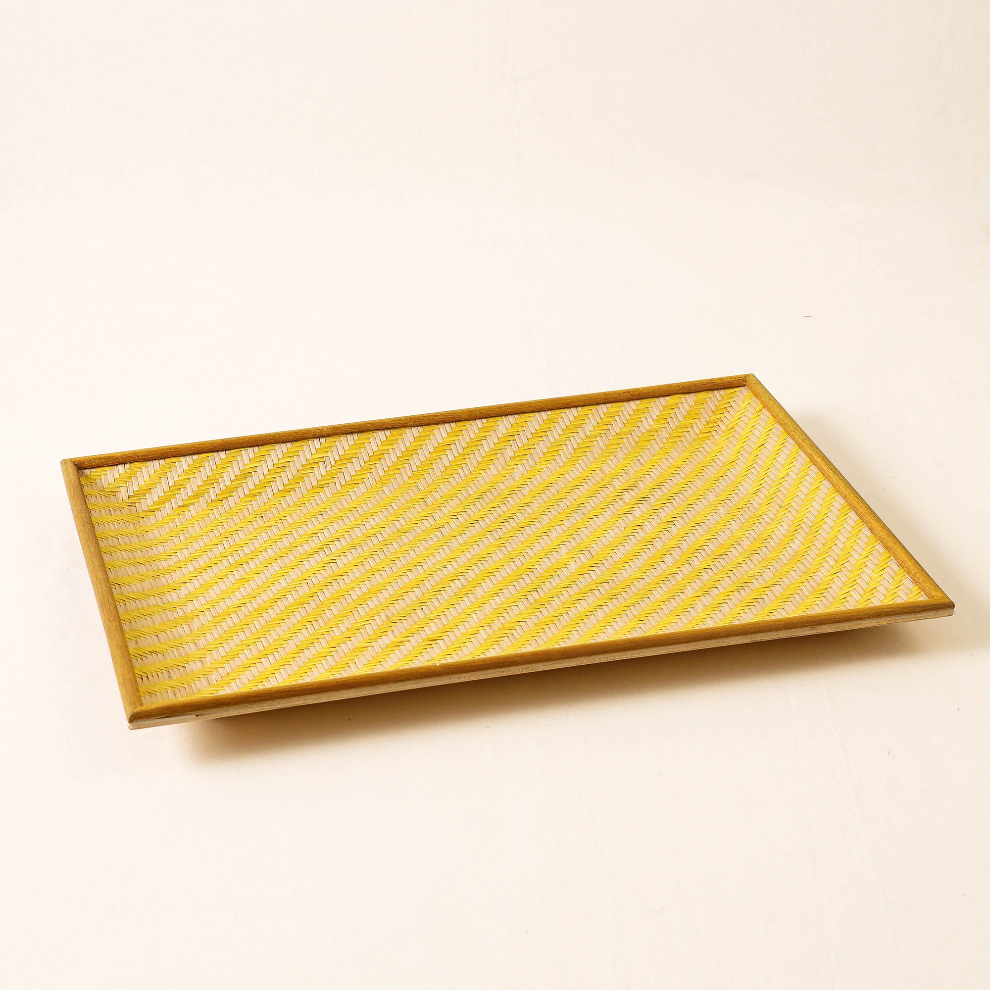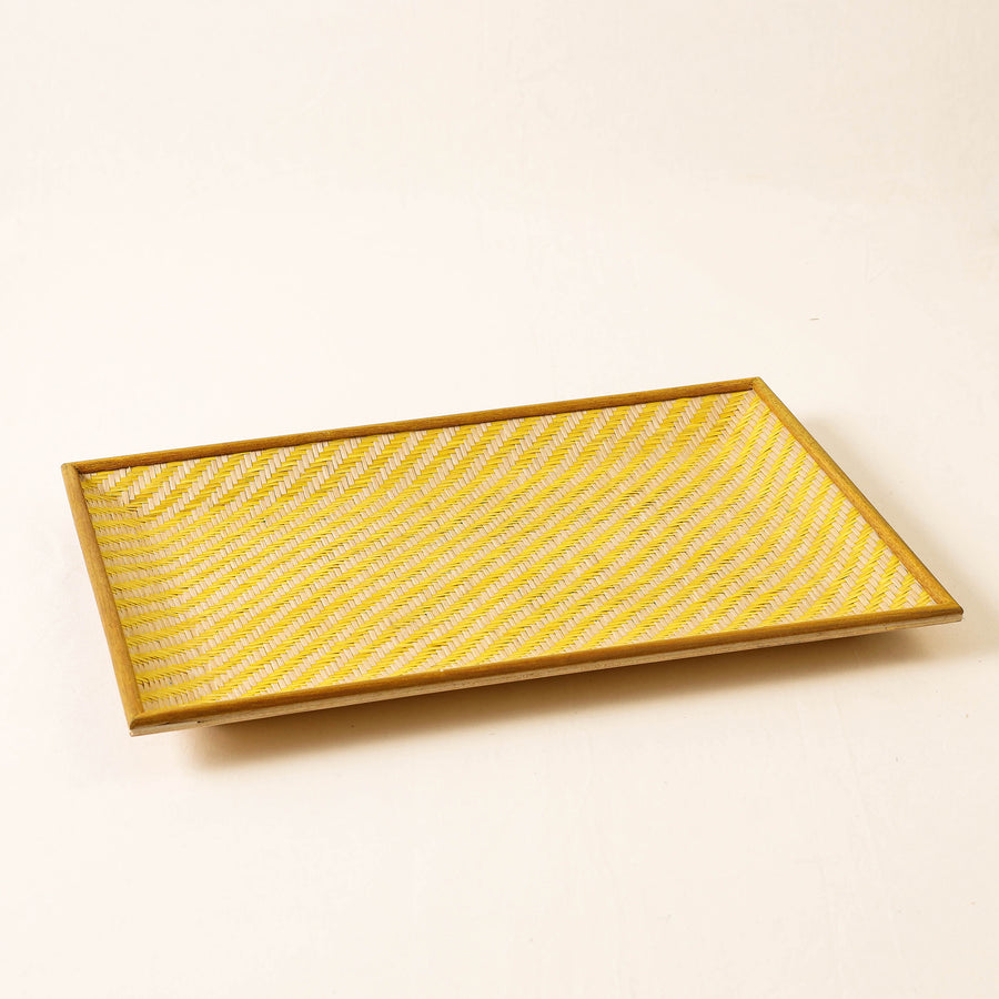 Food safe, non-plastic serving yellow Tray / serving tray in unique stylish modern design. Ideal server for your cup of tea/coffee & ideal for serving 4 cups. This trendy and unique Serving tray is made by cutting Bamboo – the fastest growing Timber/grass and splitting the same into slivers by hand. These are dip dyed in earthen pots boiling them for hours till these completely take the lead free azo free colour. well-engineered by human hands & completely bio degradable. This is handwoven by rural women & youth of west bengal using the indigenous locally available bamboo (the strongest material known in organic world) using traditional methods & this helps them sustain economically.