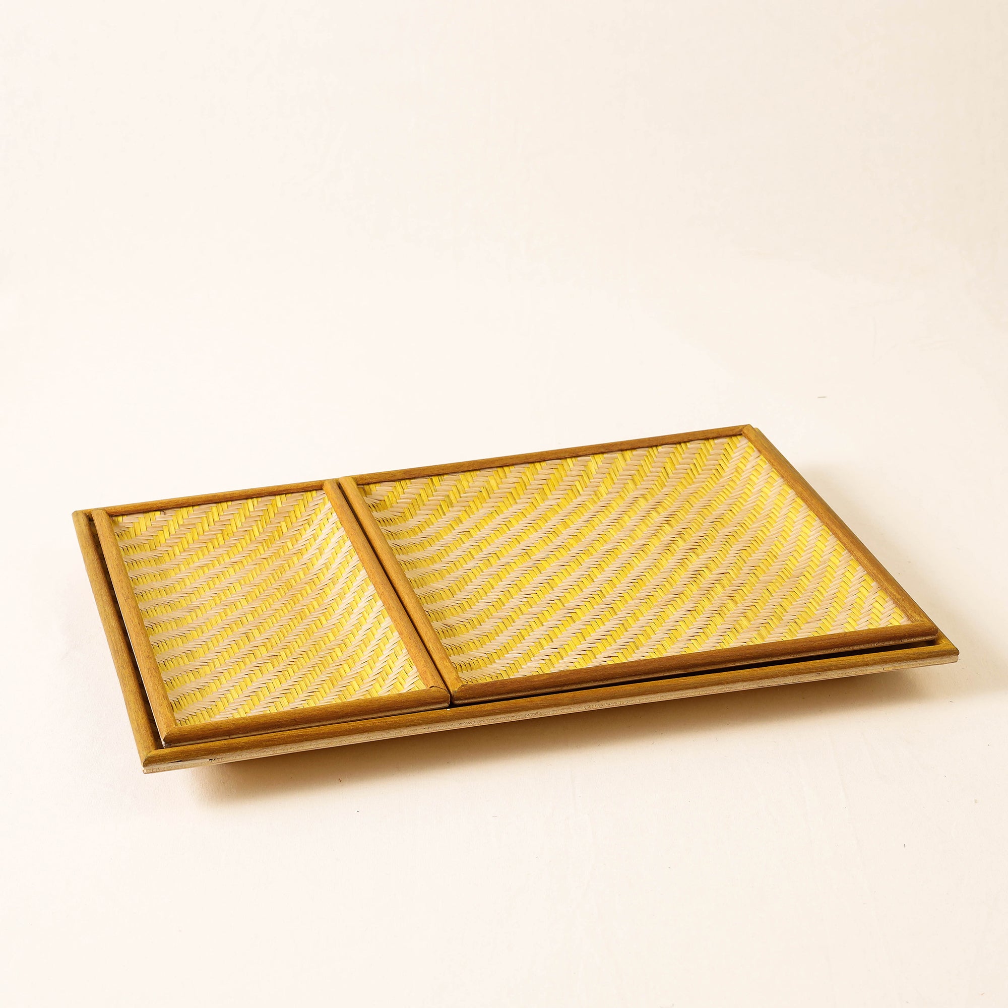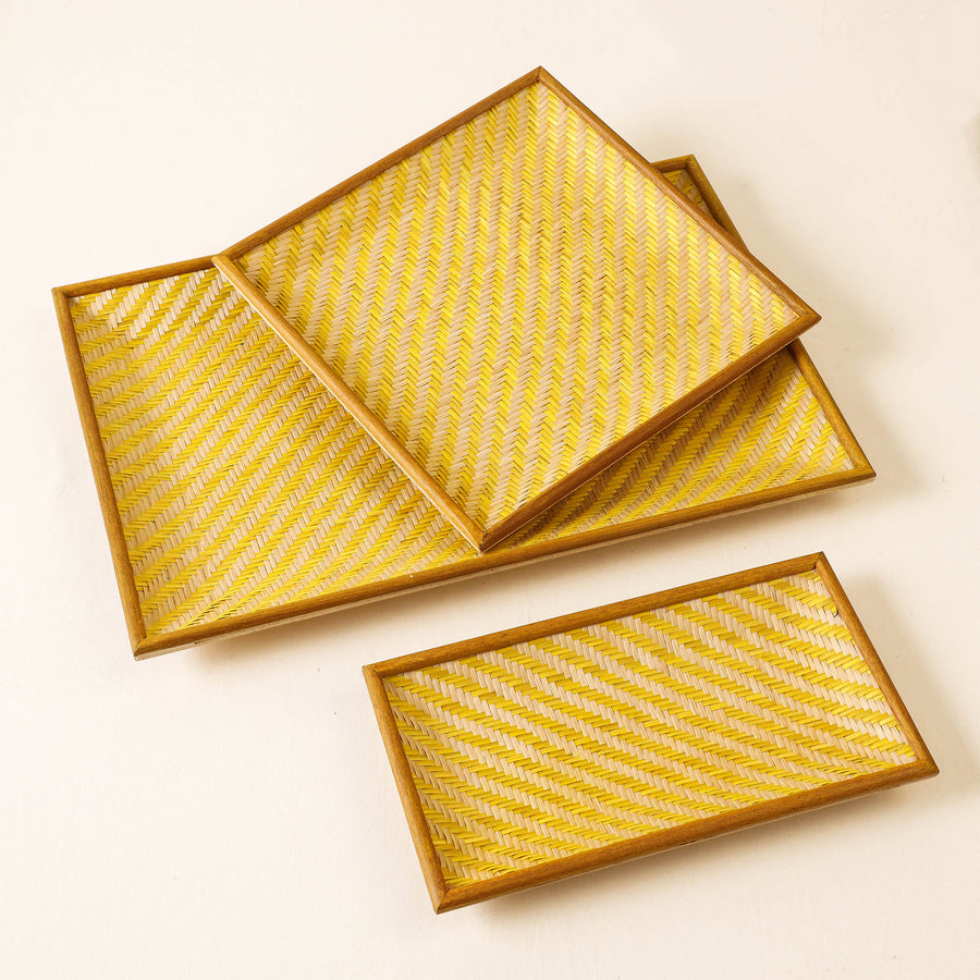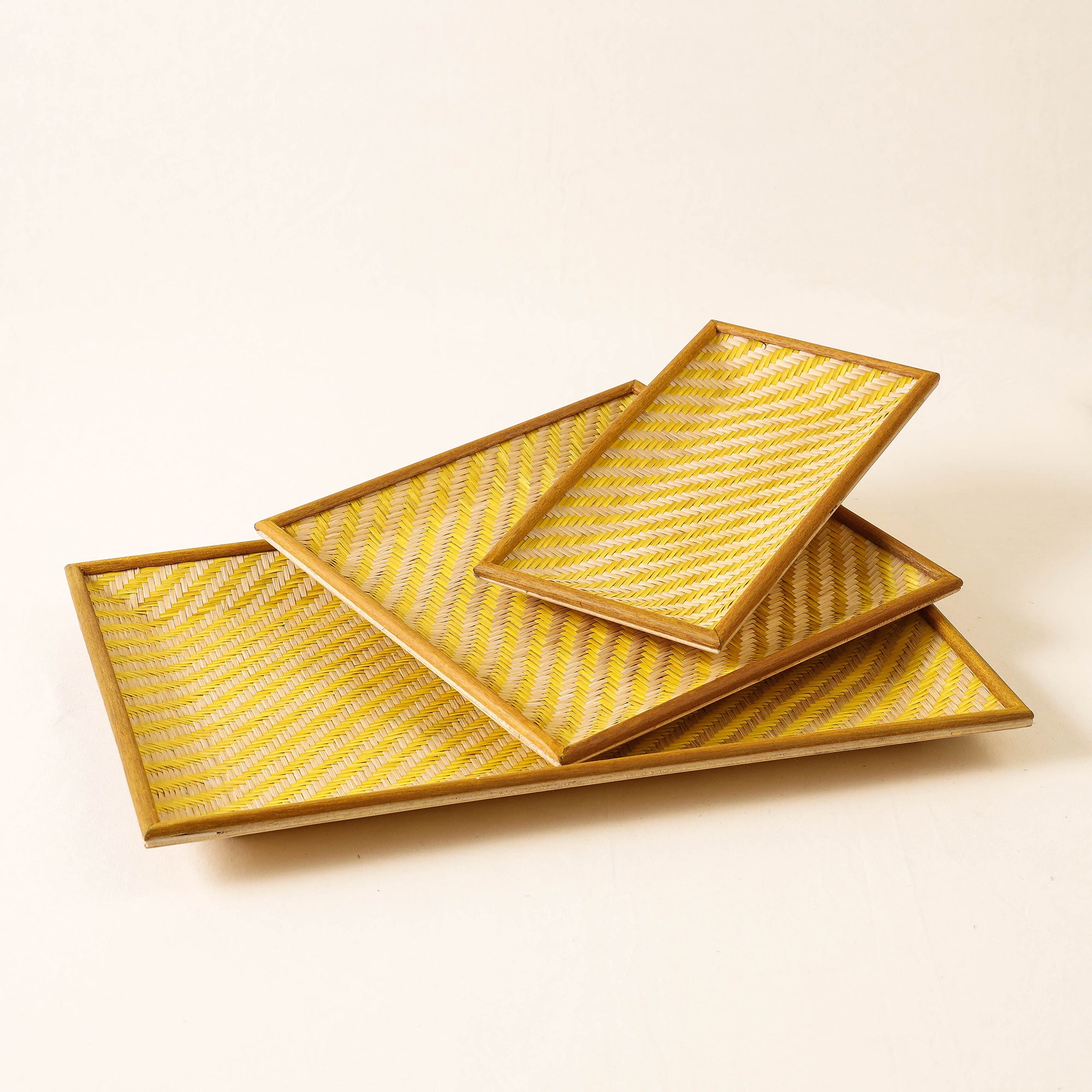 Food safe, non-plastic serving yellow Tray / serving tray in unique stylish modern design. Ideal server for your cup of tea/coffee & ideal for serving 4 cups. This trendy and unique Serving tray is made by cutting Bamboo – the fastest growing Timber/grass and splitting the same into slivers by hand. These are dip dyed in earthen pots boiling them for hours till these completely take the lead free azo free colour. well-engineered by human hands & completely bio degradable. This is handwoven by rural women & youth of west bengal using the indigenous locally available bamboo (the strongest material known in organic world) using traditional methods & this helps them sustain economically.