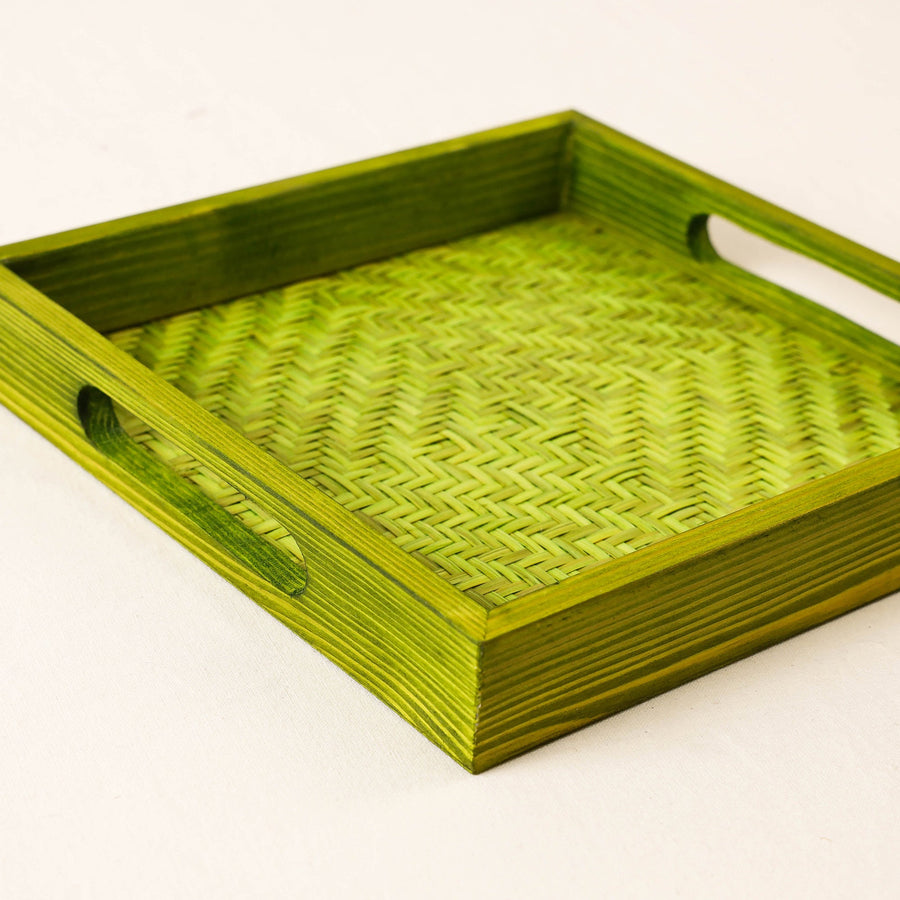 Food safe, non-plastic serving green tray in unique stylish modern & organic design. Ideal server for gatherings of all sizes & also serving heavy glass & ceramic bowls. extremely sturdy to serve stem glasses as well. This trendy and unique product is made by cutting bamboo – the fastest growing timber/grass and splitting the same into slivers by hand. these are dip dyed in earthen pots boiling them for hours till these completely take the lead free azo free colour. well-engineered by human hands & completely bio degradable. This is handwoven by rural women & youth of west bengal using the indigenous locally available bamboo (the strongest material known in organic world) using traditional methods & this helps them sustain economically.