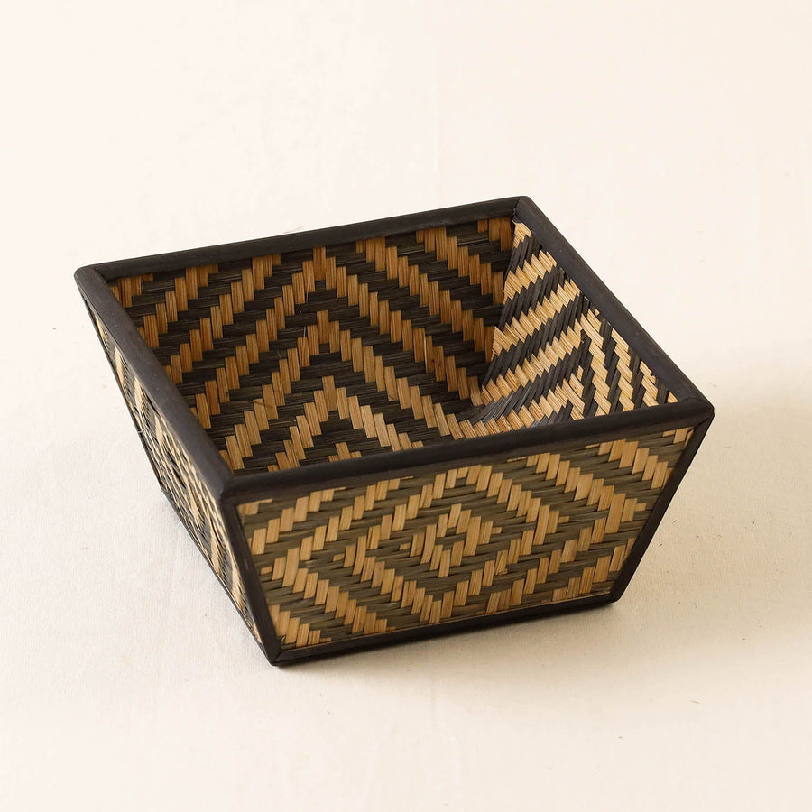 Food safe, non plastic square shape basket for serving breads/ whole fruits/ cereal for your healthy organic breakfast. This trendy and unique product is made by cutting bamboo – the fastest growing timber/grass and splitting the same into slivers by hand. these are dip dyed in earthen pots boiling them for hours till these completely take the lead free azo free colour. well-engineered by human hands & completely bio degradable. This is handwoven by rural women & youth of west bengal using the indigenous locally available bamboo (the strongest material known in organic world) using traditional methods & this helps them sustain economically.