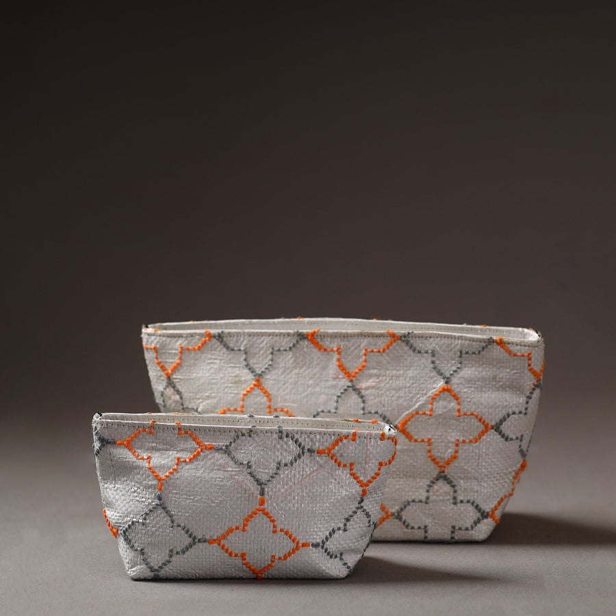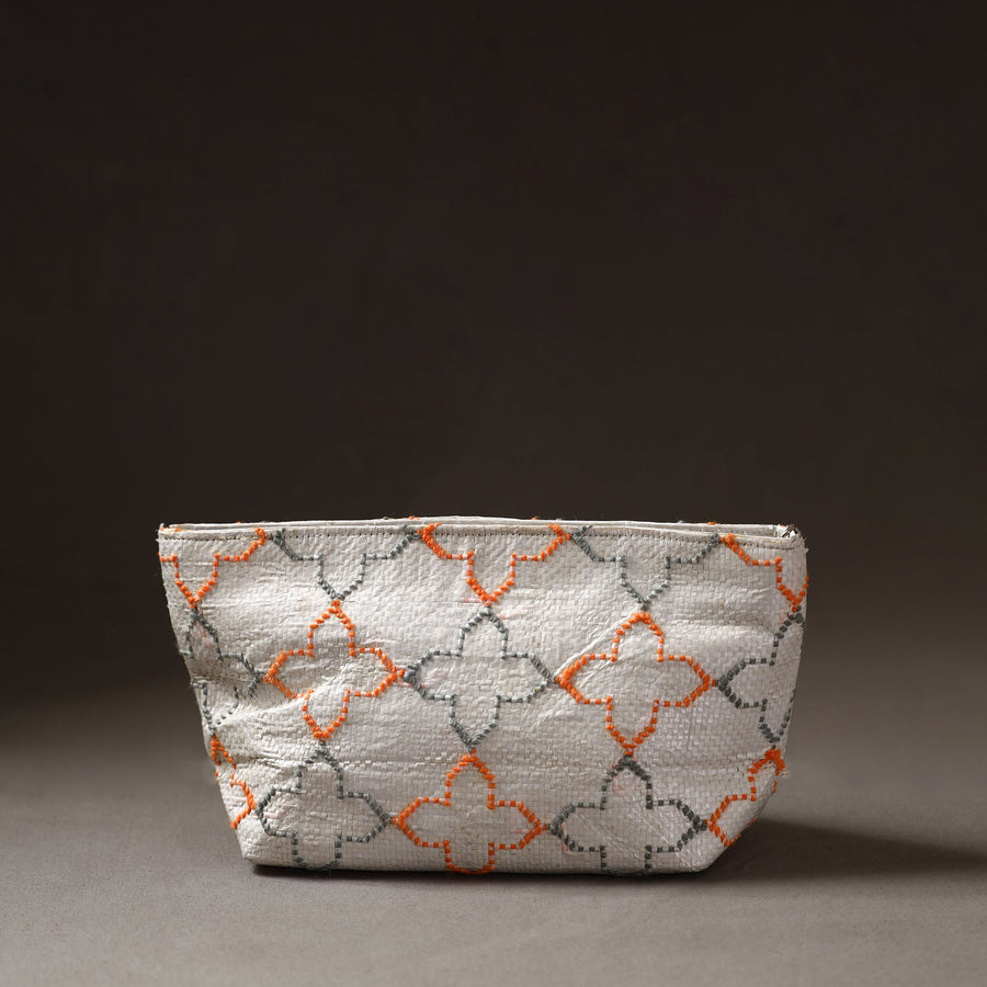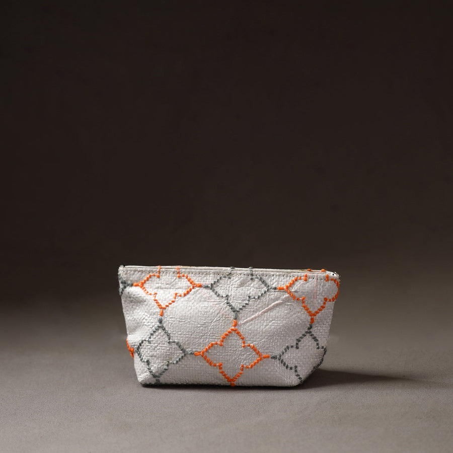Handcrafted multipurpose pouch made from Taat (upcycled plastic) with intricate wool thread embroidery made by rural artisans of Hardoi district, Uttar Pradesh. It has ample space to keep most of your essentials.