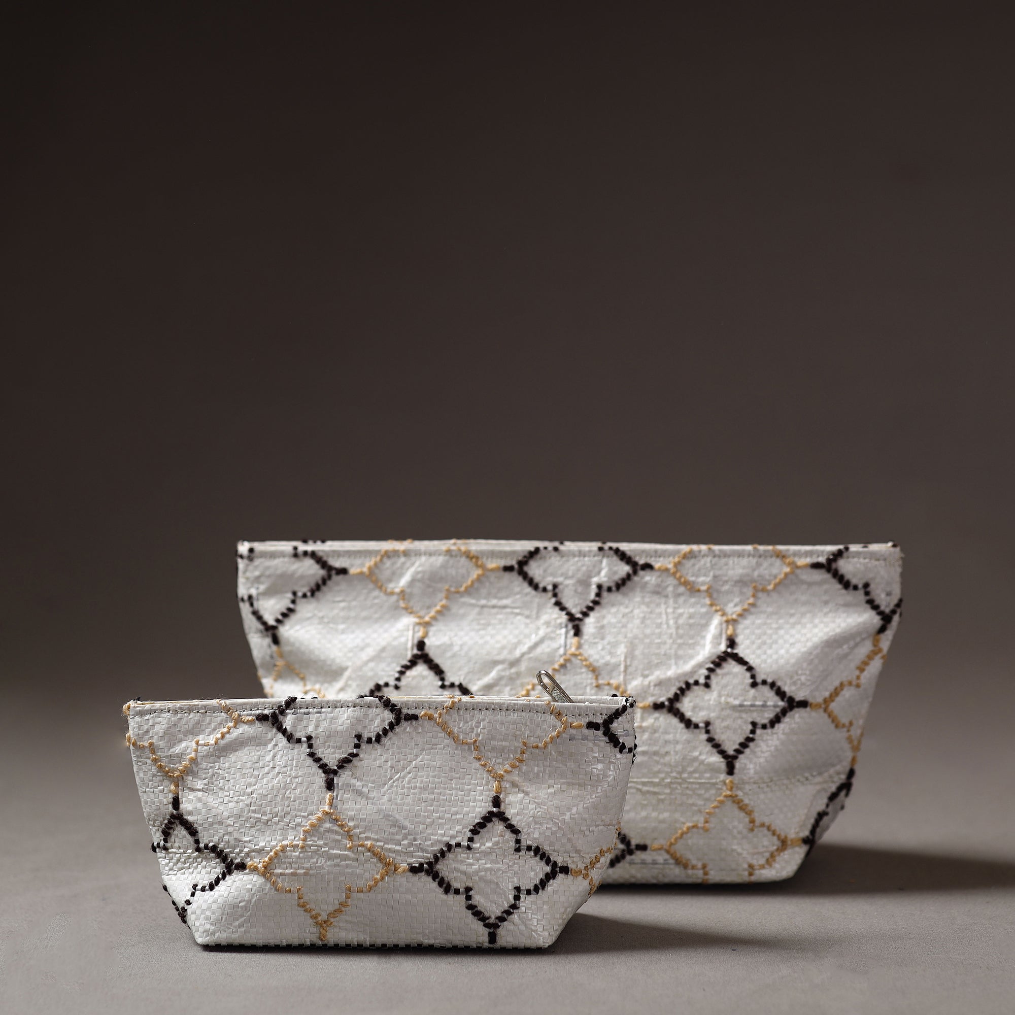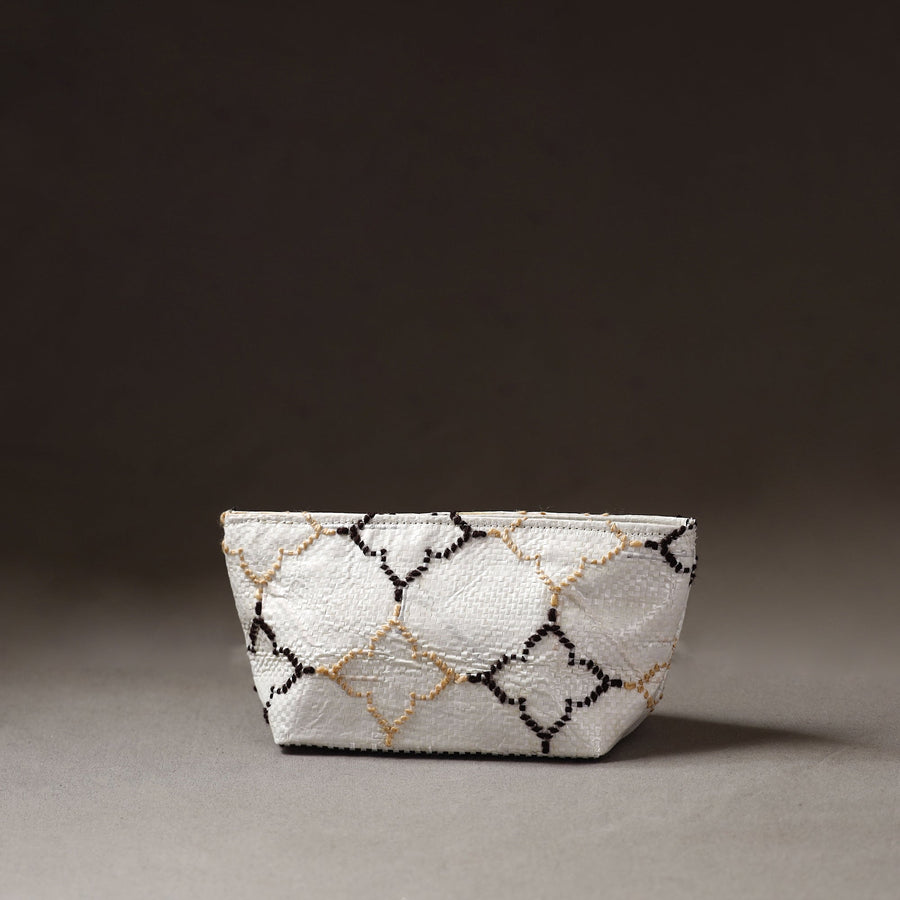 Handcrafted multipurpose pouch made from Taat (upcycled plastic) with intricate wool thread embroidery made by rural artisans of Hardoi district, Uttar Pradesh. It has ample space to keep most of your essentials.