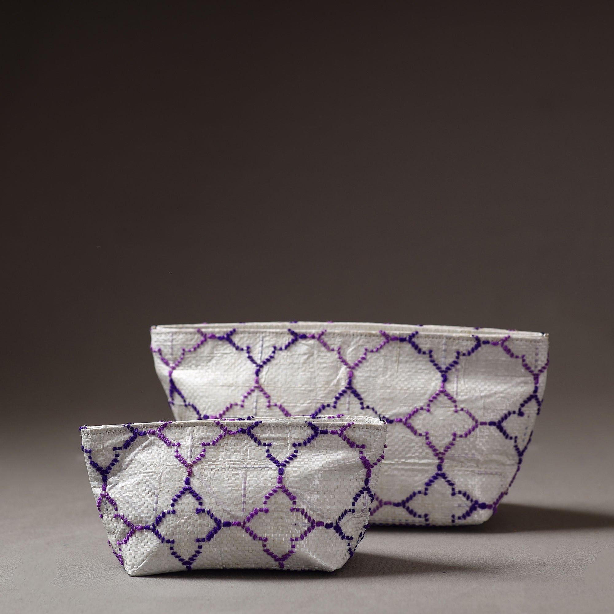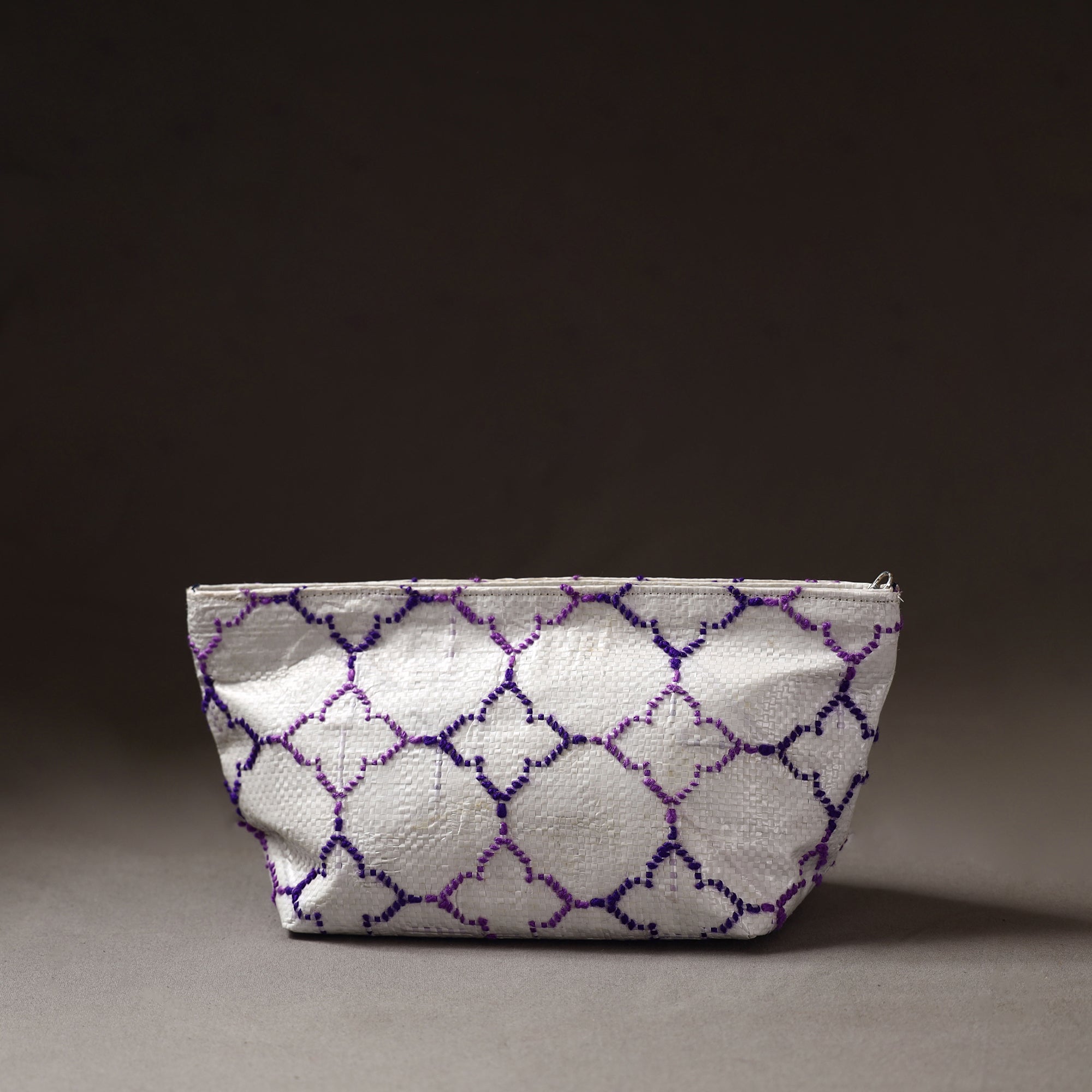 Handcrafted multipurpose pouch made from Taat (upcycled plastic) with intricate wool thread embroidery made by rural artisans of Hardoi district, Uttar Pradesh. It has ample space to keep most of your essentials.