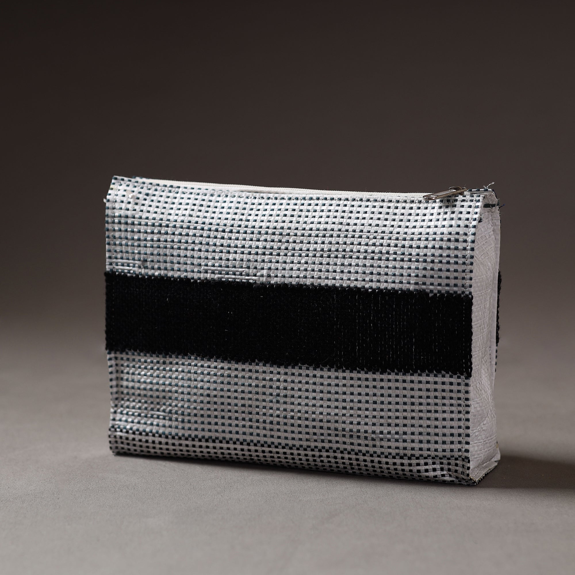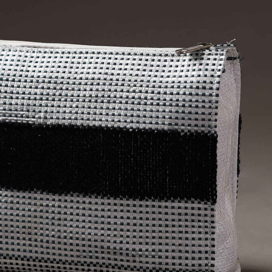 Handcrafted multipurpose/travel pouch made from Taat (upcycled plastic) with intricate wool thread embroidery made by rural artisans of Hardoi district, Uttar Pradesh. It has one zipper pocket inside. It has ample space to keep most of your essentials.