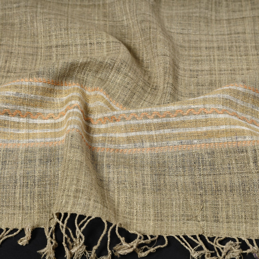 Fine quality traditional handspun handloom eri natural dyed stole. Eri silk is a staple fiber, unlike other silks, which are continuous filament. The texture of the fabric is coarse, fine, and dense. It is very strong, durable, and elastic. Eri silk is darker and heavier than other silks and blends well with wools and cotton. Due to its thermal properties it is warm in winter and cool in summer.