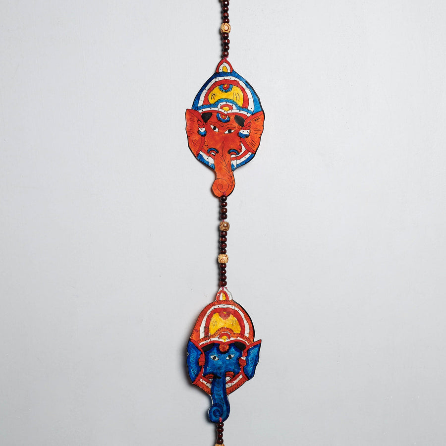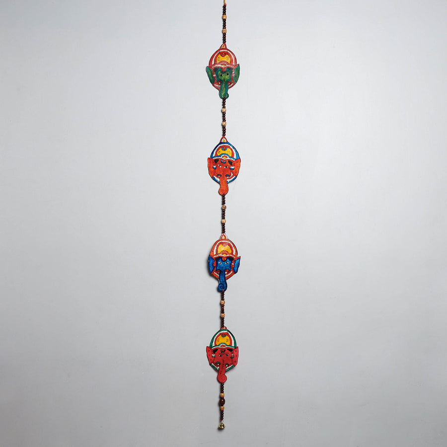 | Material | Fine handmade Tholu Bommalata leather puppet wall hanging with wooden beads. Tholu Bommalata is the shadow puppet theatre tradition of the state of Andhra Pradesh in India. Tholu bommalata literally means "the dance of leather puppets" (tholu – "leather" and bommalata – "puppet dance") is a 2000 year old craft and is one of the oldest form of performing arts.. The traditional process of crafting shadow puppets requires 30-40 days, from the procurement of leather to the completion of the product. Two other kinds of shadow puppetry are practiced in Andhra Pradesh, the Sutram Bommalata (String puppets) and the Koyya Bommalata(Wooden puppets). The leather puppets, because of their transparency and jewel like glow, are most popular. The puppets are mounted in the middle on a palm stem, extended to form a handle used to move the body of the puppet. The puppets are painted with hands using natural and poster colours. But apart from the translucency and vivid colours, what gives these puppets their brilliance, is the perforated designs drawn on the characters to depict jewellery. Once surrounded by colour and viewed against the light, they look like glowing jewels. |