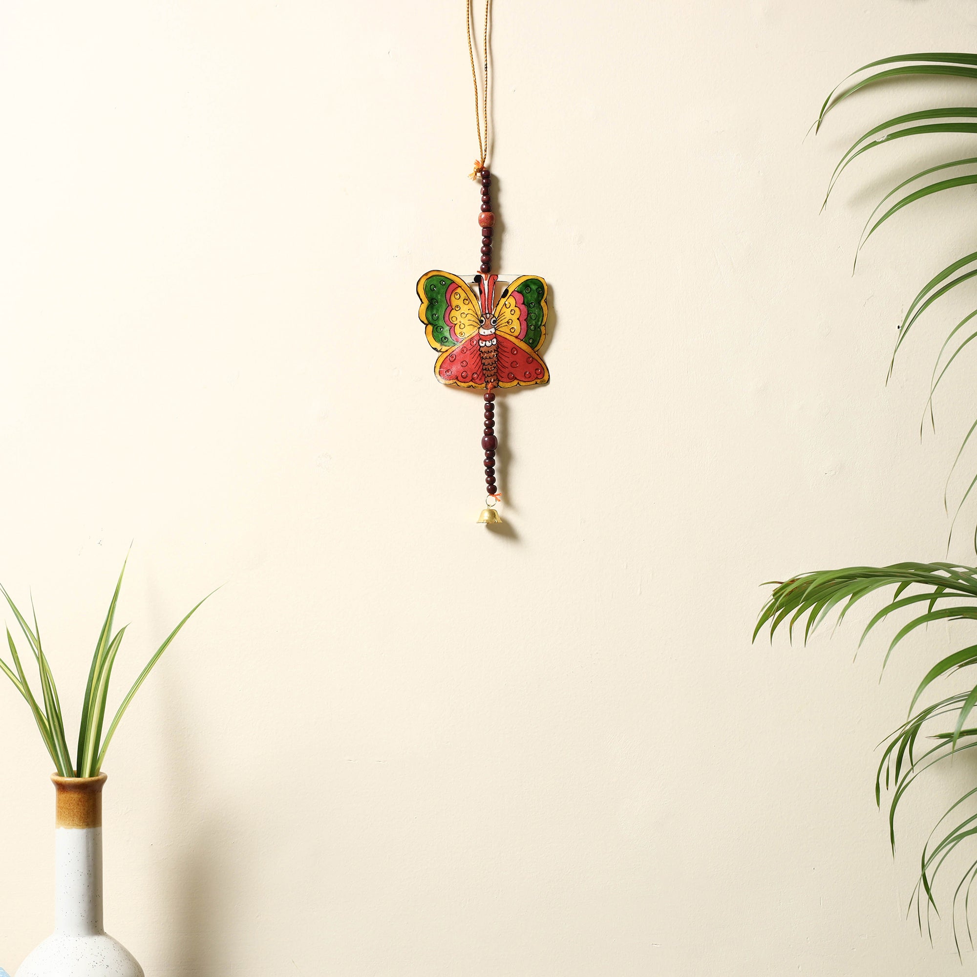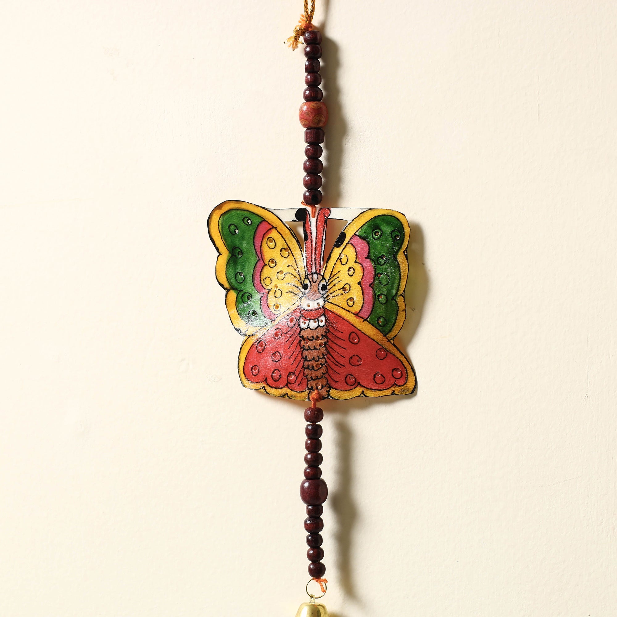 | Material | Fine handmade Tholu Bommalata leather puppet wall hanging with wooden beads. Tholu Bommalata is the shadow puppet theatre tradition of the state of Andhra Pradesh in India. Tholu bommalata literally means "the dance of leather puppets" (tholu – "leather" and bommalata – "puppet dance") is a 2000 year old craft and is one of the oldest form of performing arts.. The traditional process of crafting shadow puppets requires 30-40 days, from the procurement of leather to the completion of the product. Two other kinds of shadow puppetry are practiced in Andhra Pradesh, the Sutram Bommalata (String puppets) and the Koyya Bommalata(Wooden puppets). The leather puppets, because of their transparency and jewel like glow, are most popular. The puppets are mounted in the middle on a palm stem, extended to form a handle used to move the body of the puppet. The puppets are painted with hands using natural and poster colours. But apart from the translucency and vivid colours, what gives these puppets their brilliance, is the perforated designs drawn on the characters to depict jewellery. Once surrounded by colour and viewed against the light, they look like glowing jewels. |