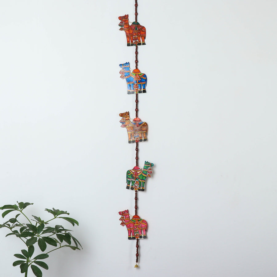 | Material | Fine handmade Tholu Bommalata leather puppet wall hanging with wooden beads. Tholu Bommalata is the shadow puppet theatre tradition of the state of Andhra Pradesh in India. Tholu bommalata literally means "the dance of leather puppets" (tholu – "leather" and bommalata – "puppet dance") is a 2000 year old craft and is one of the oldest form of performing arts.. The traditional process of crafting shadow puppets requires 30-40 days, from the procurement of leather to the completion of the product. Two other kinds of shadow puppetry are practiced in Andhra Pradesh, the Sutram Bommalata (String puppets) and the Koyya Bommalata(Wooden puppets). The leather puppets, because of their transparency and jewel like glow, are most popular. The puppets are mounted in the middle on a palm stem, extended to form a handle used to move the body of the puppet. The puppets are painted with hands using natural and poster colours. But apart from the translucency and vivid colours, what gives these puppets their brilliance, is the perforated designs drawn on the characters to depict jewellery. Once surrounded by colour and viewed against the light, they look like glowing jewels. |