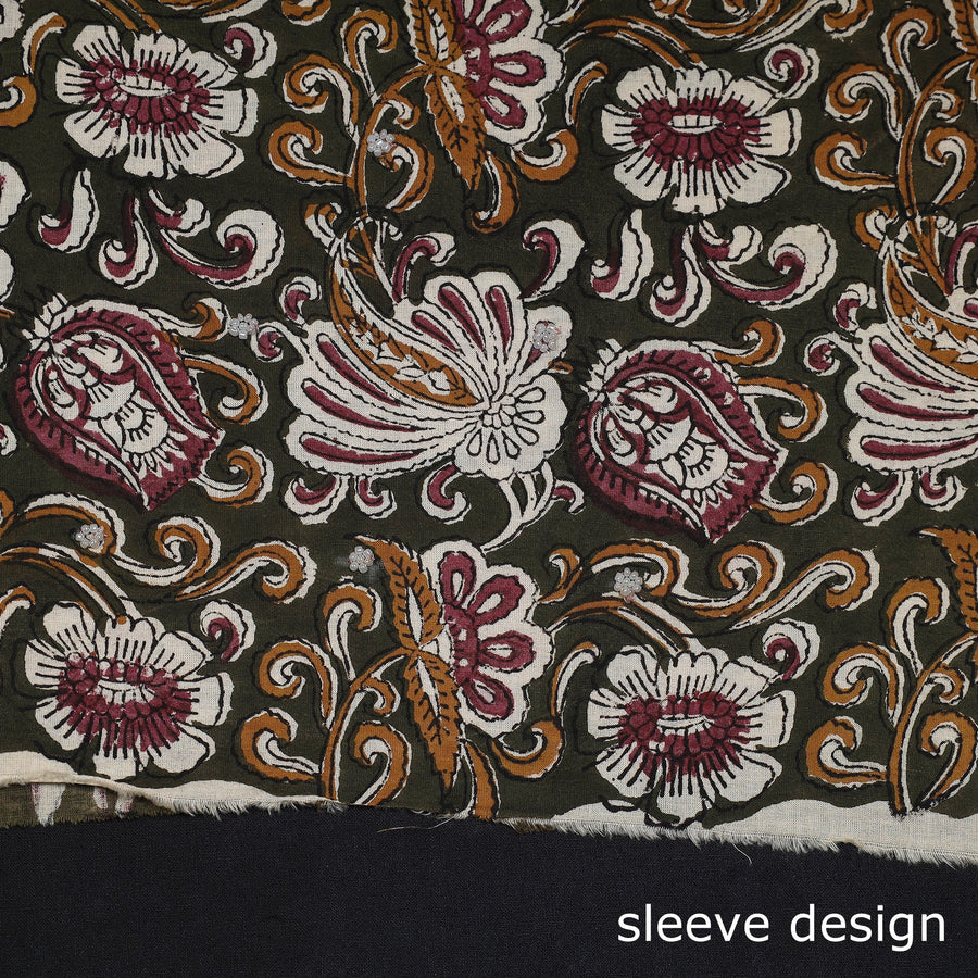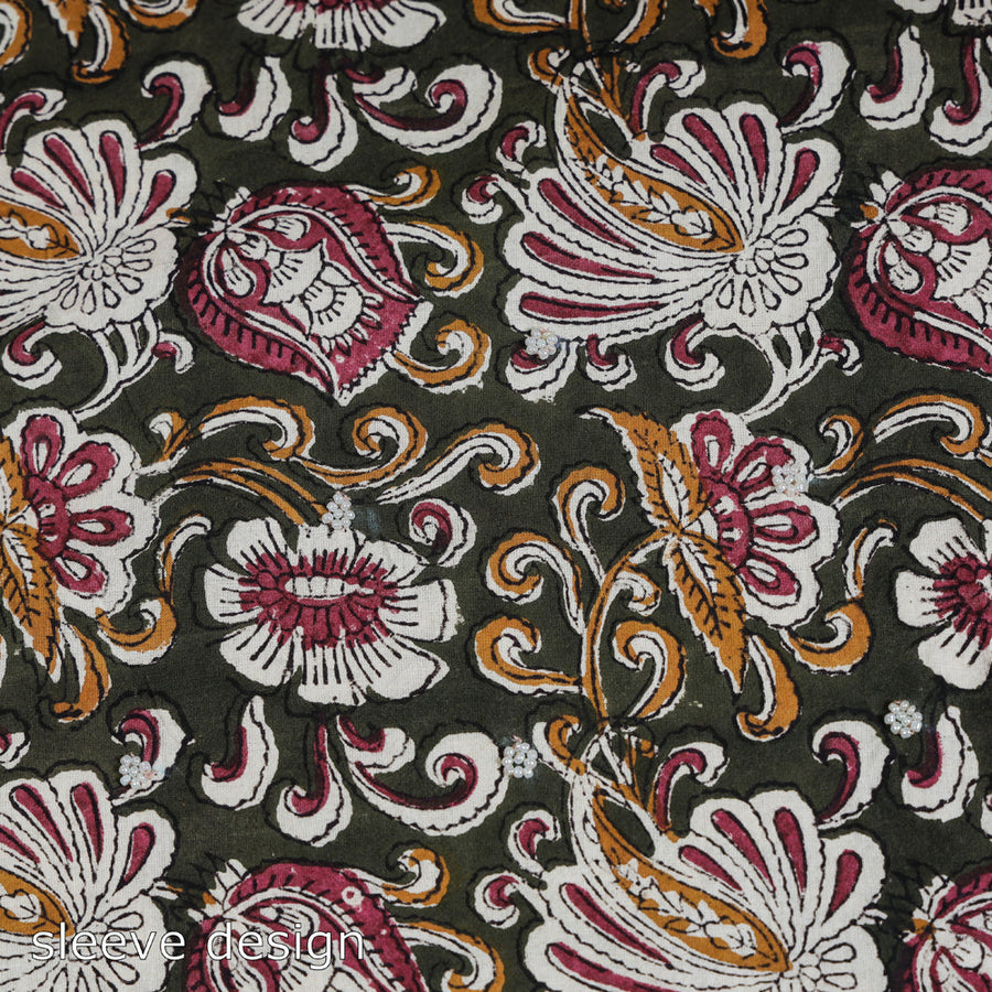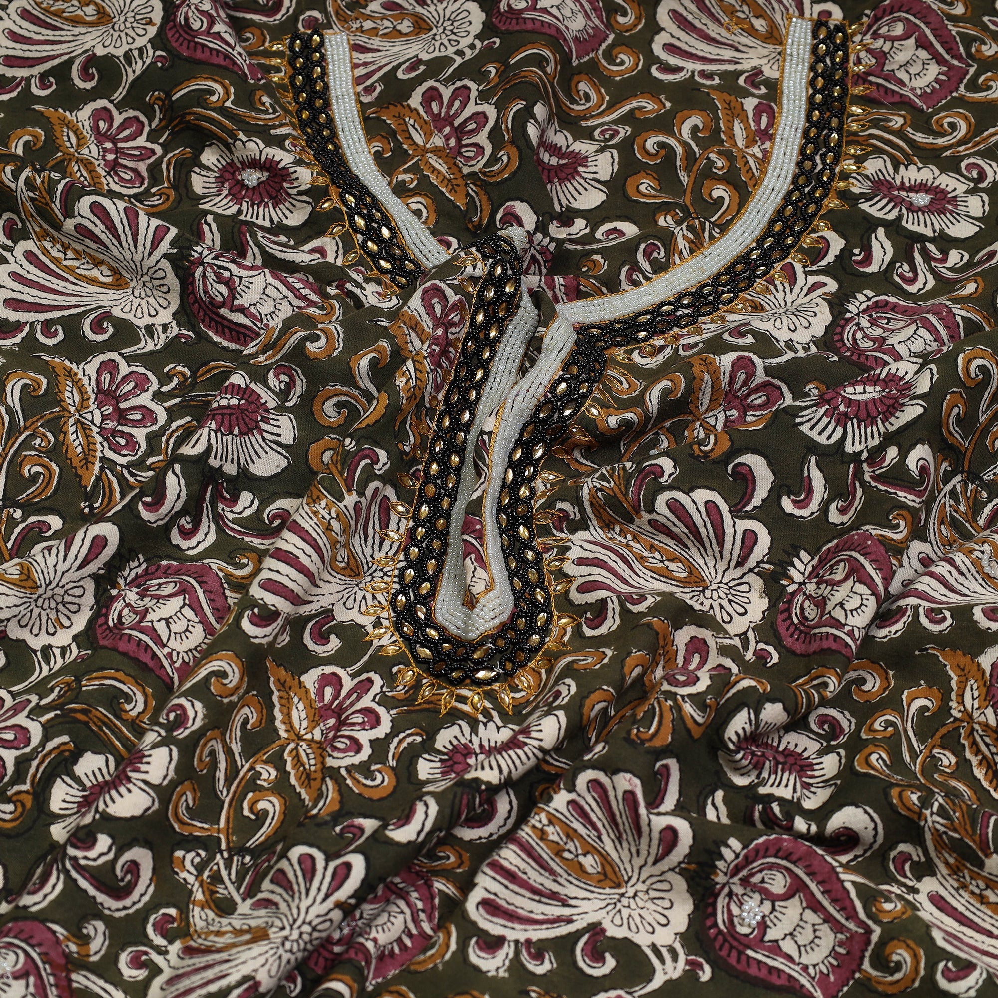 Fine quality green bead work embroidery bagru print cotton kurta material made using natural dyes through traditional mud resist process by using hand carved wooden block practiced in Bagru, Rajasthan.