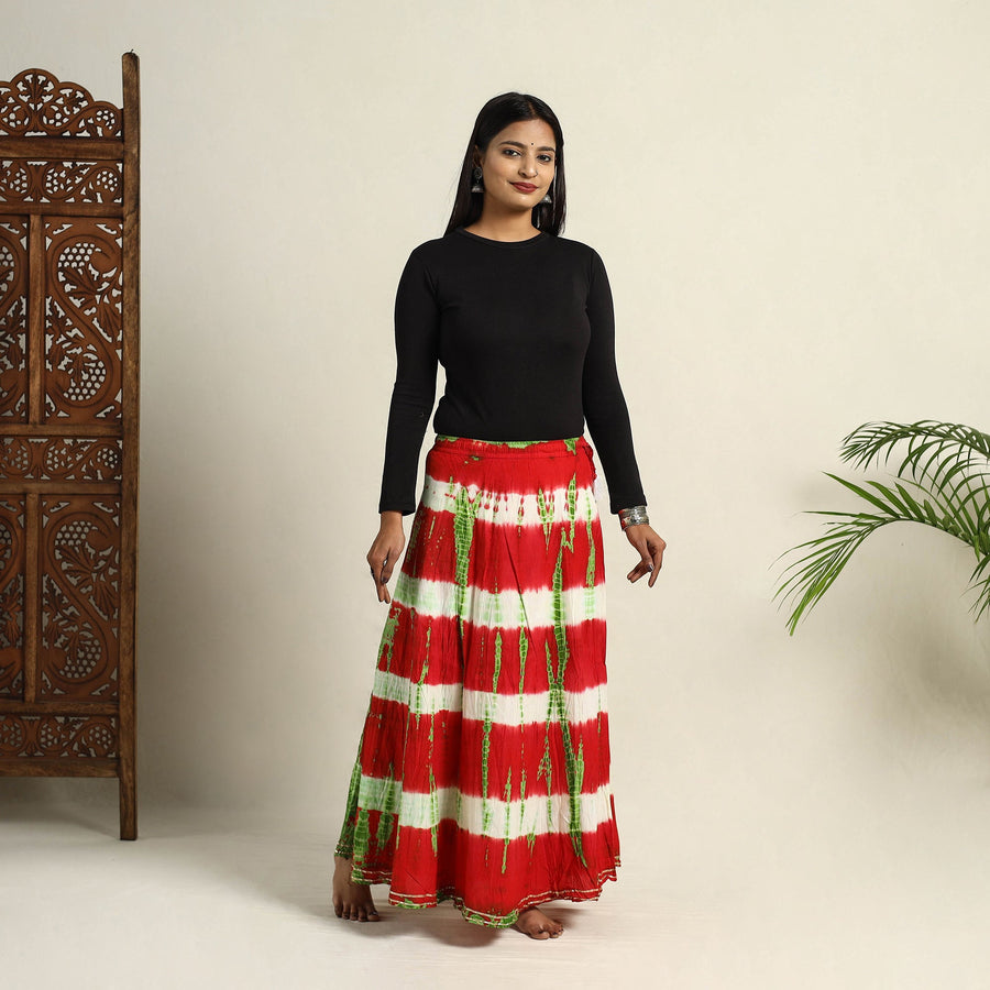 Fine quality red shibori tie-dye pure cotton long skirt from Rajasthan. This skirt is hand dyed using shibori tie and dye technique in which the fabric is tied using clamp or stitches in the required design and the pattern is dyed.