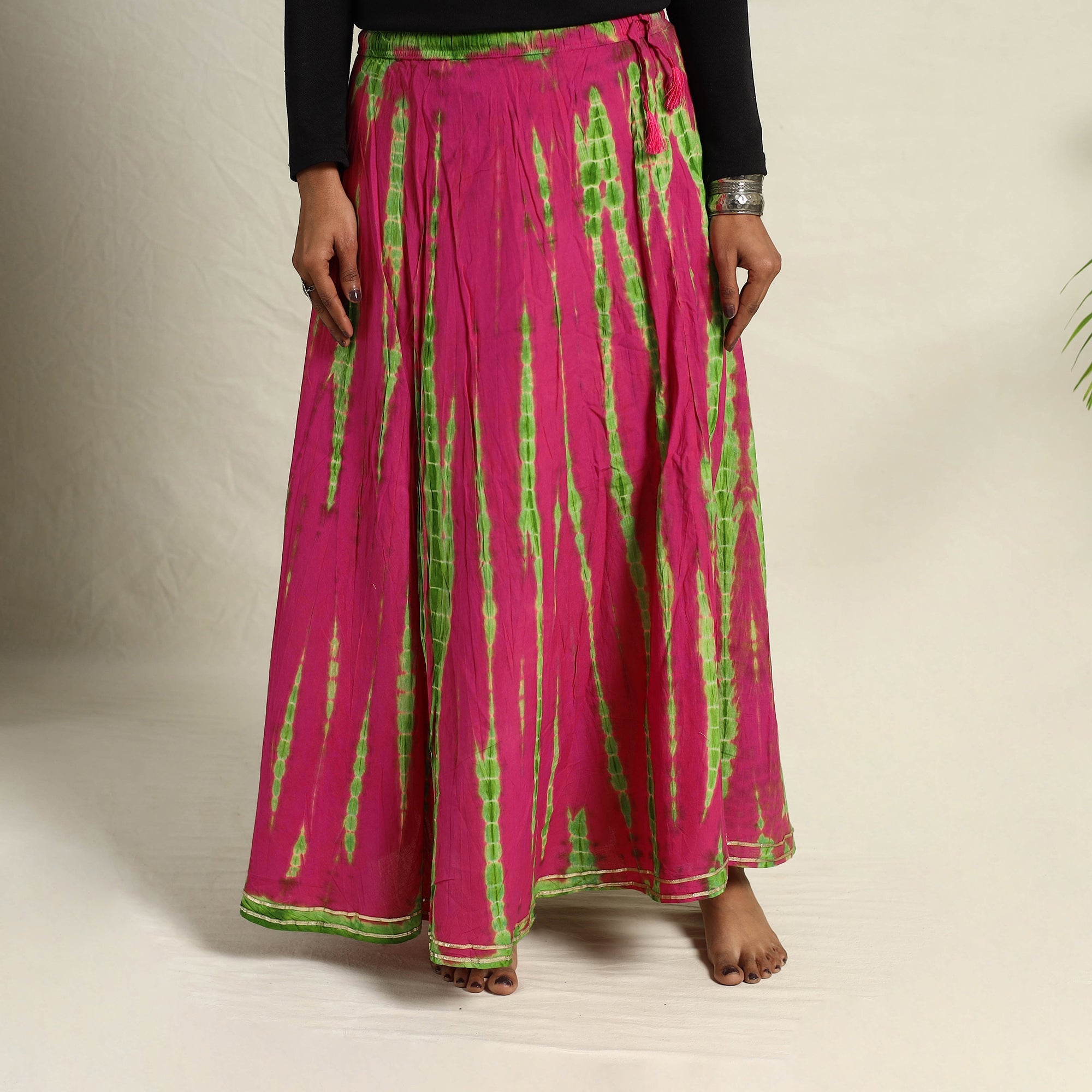 Fine quality pink shibori tie-dye pure cotton long skirt from Rajasthan. This skirt is hand dyed using shibori tie and dye technique in which the fabric is tied using clamp or stitches in the required design and the pattern is dyed.