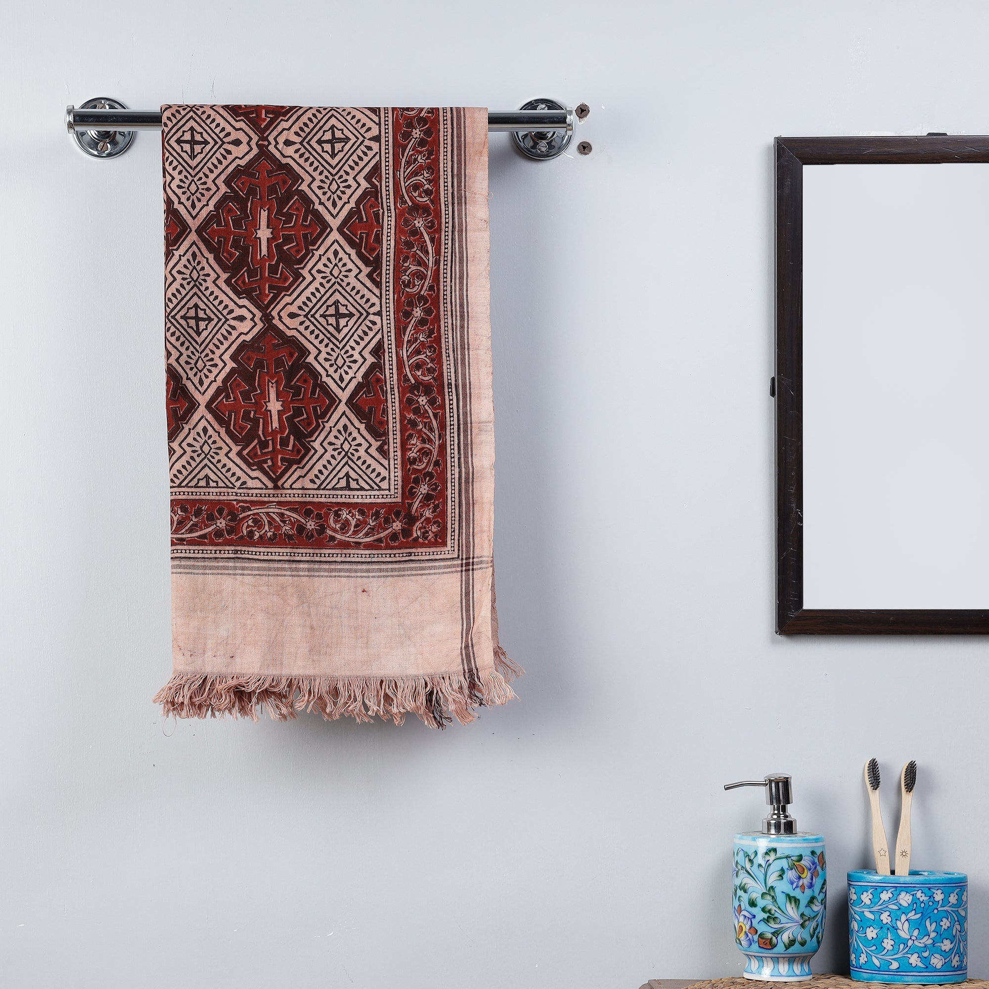 Fine quality original pedana red kalamkari hand block printed natural dyed handloom pure cotton towel crafted by the skillful artisans of Pedana. Showcasing an assortment of hand block printed motifs inspired by traditional kalamkari painting. Kalamkari is the earliest and more complex techniques of block-printing.