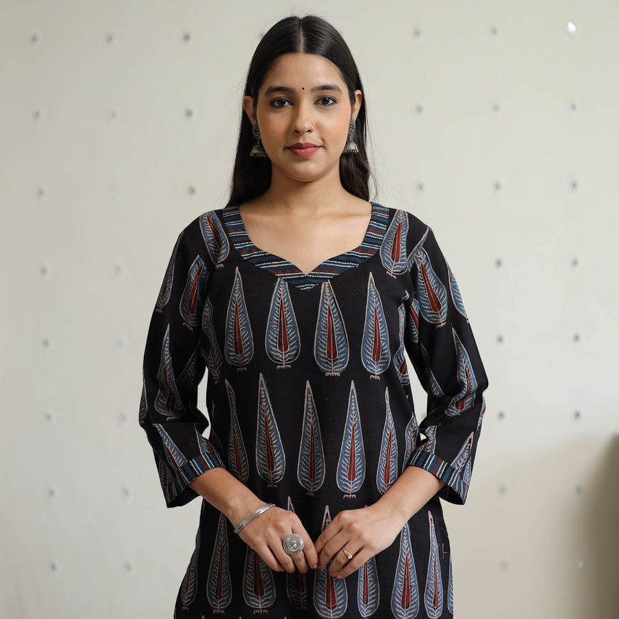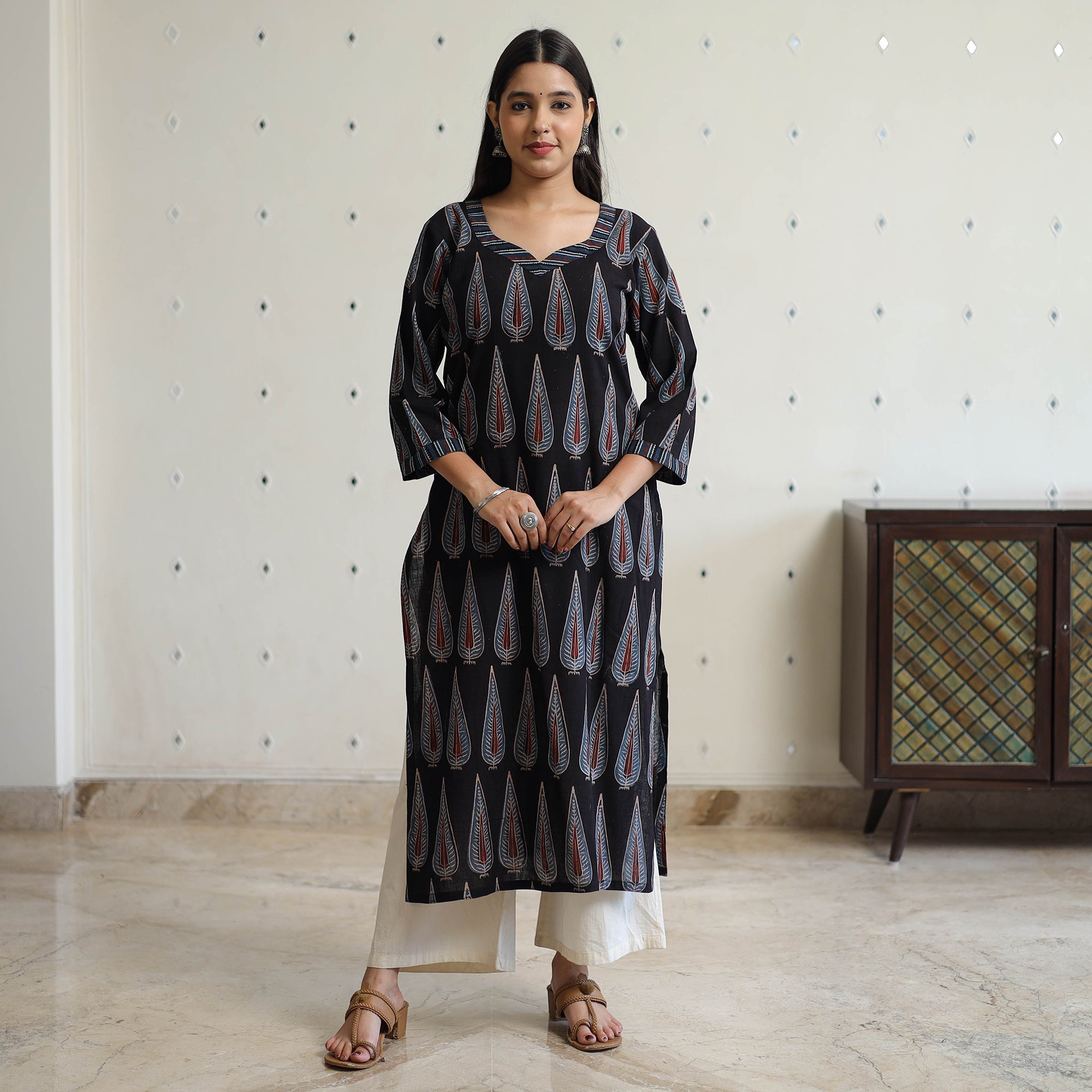 Authentic black ajrakh hand block printed pure cotton kurta with side pocket. The fabric has been made using natural dyes through traditional process of hand block printing practiced by the artisans in Kutch region of Gujarat.Ajrakh is a traditional vegetable dyeing and resist block-printing technique on cloth. It is estimated to be around 4,500 years old. The Ajrakh artisans in India are originally from Sindh and they migrated to Kutch in Gujarat and Barmer in Rajasthan. Ajrakh is the traditional attire of the Maldhari pastoral community of Bhuj. The process of 'Ajrakh' is a long drawn process with many stages and each layer of colour is printed after a gap of time so the cloth has to stay for the day.