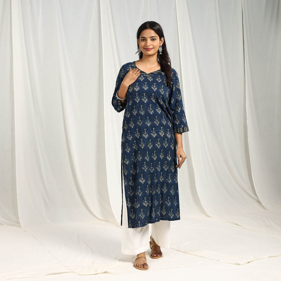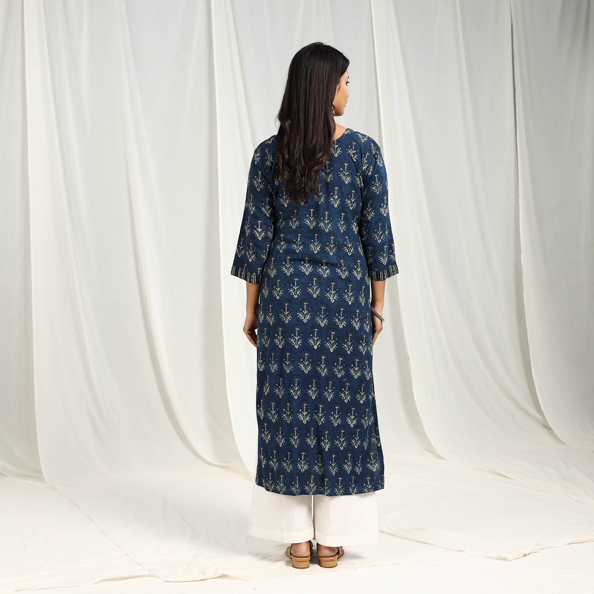 Crafted from fine-quality cotton, this blue block printed cotton straight ajrakh kurta is made using natural dyes through a traditional process practiced by artisans in Kutch, Gujarat. The intricate resist block-printing technique adds timeless charm. Designed for comfort, this kurta features a breathable fabric and a convenient side pocket, making it perfect for both casual and formal wear.