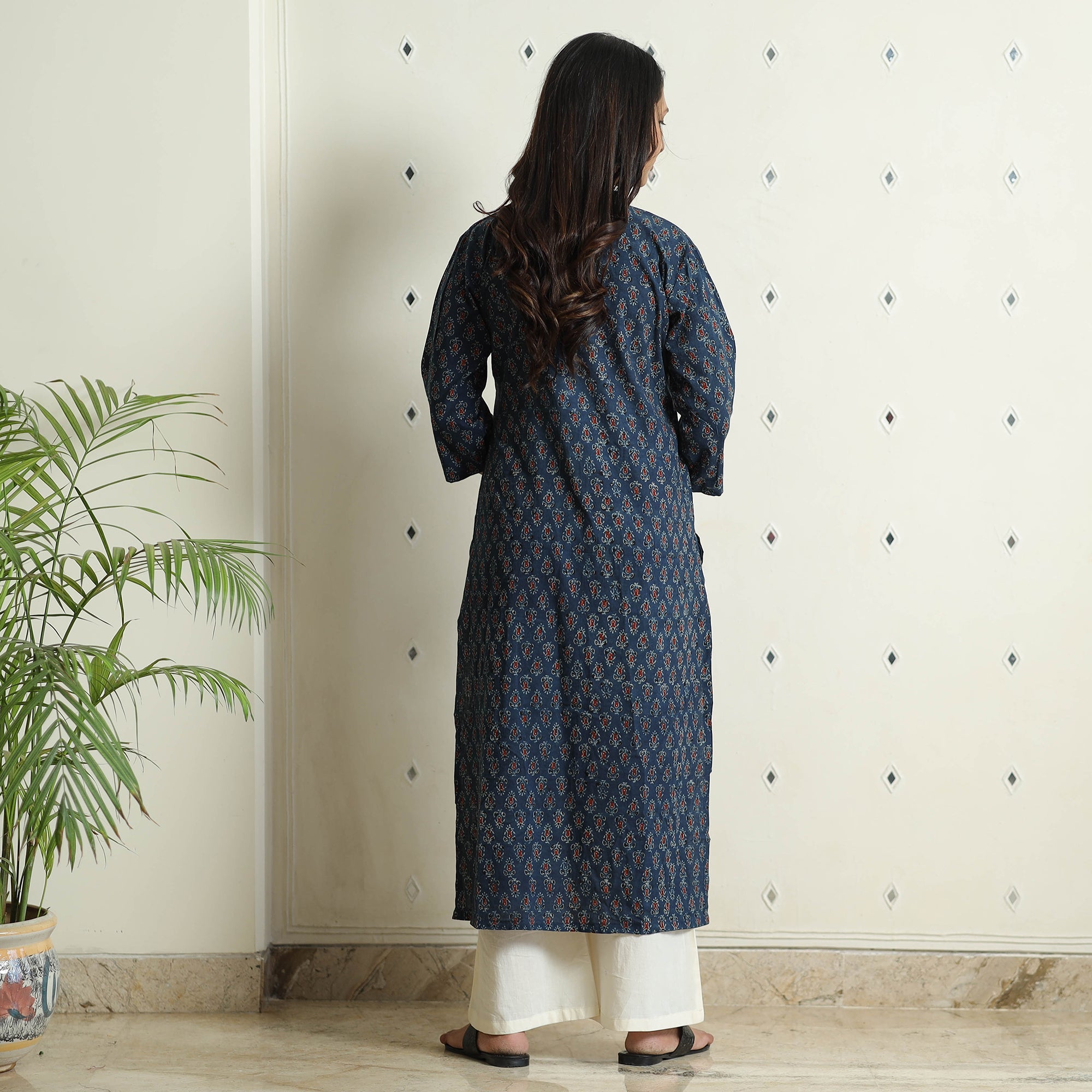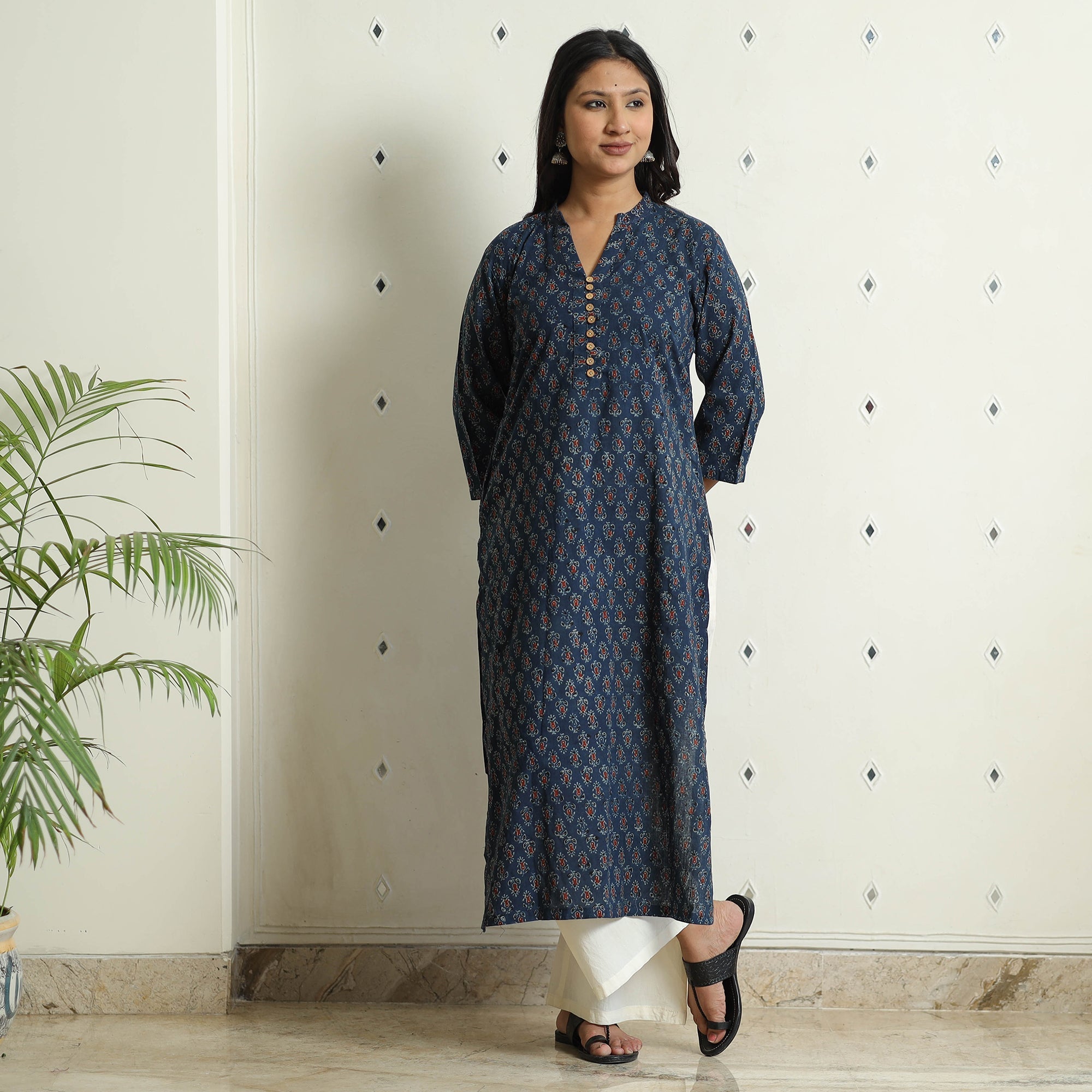 Authentic Ajrakh hand block printed pure cotton 3/4 sleeves kurta with side pocket. The fabric has been made using natural dyes through traditional process of hand block printing practiced by the artisans in Kutch region of Gujarat. Ajrakh is a traditional vegetable dyeing and resist block-printing technique on cloth. It is estimated to be around 4,500 years old. The Ajrakh artisans in India are originally from Sindh and they migrated to Kutch in Gujarat and Barmer in Rajasthan. Ajrakh is the traditional attire of the Maldhari pastoral community of Bhuj. The process of 'Ajrakh' is a long drawn process with many stages and each layer of colour is printed after a gap of time so the cloth has to stay for the day.