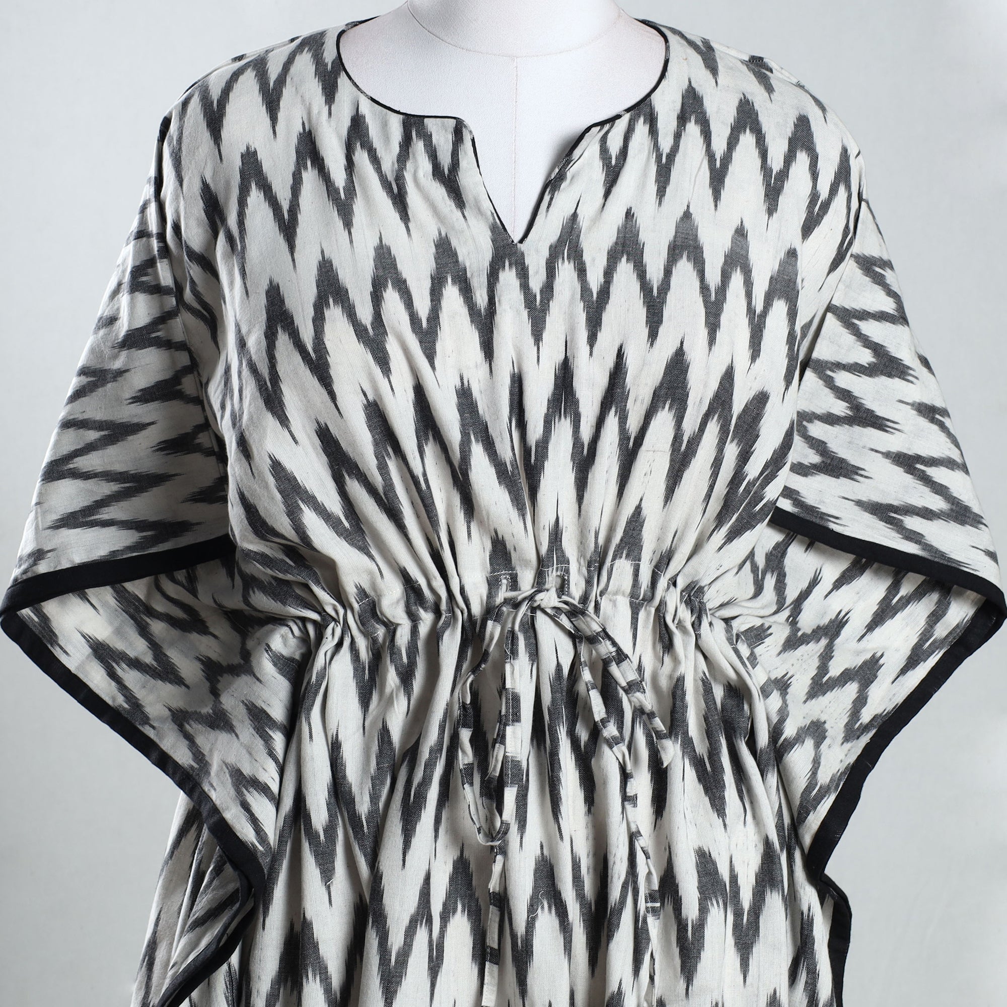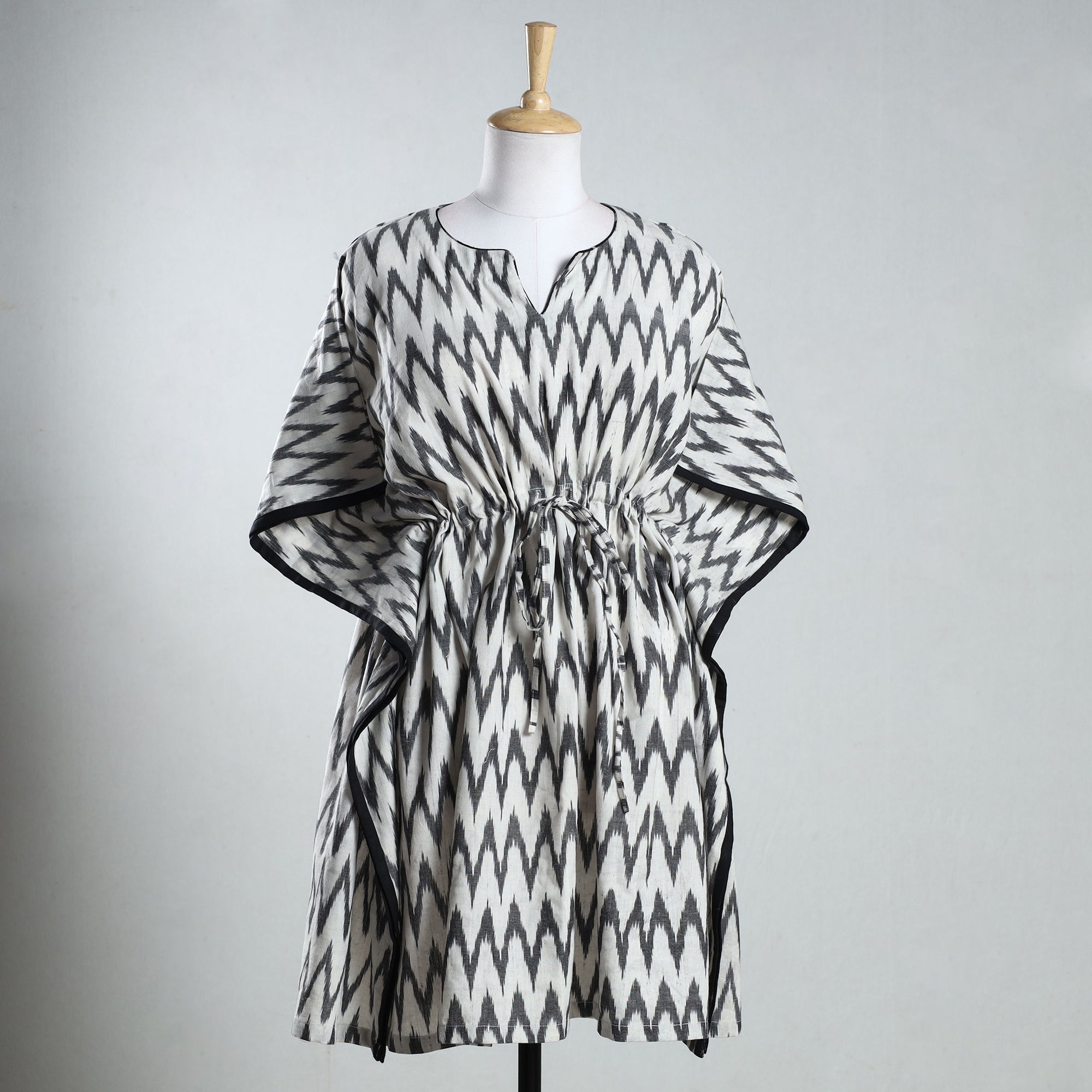 Fine quality ikat weave cotton medium kaftan with adjustable drawstring waist tie. A traditional kaftan or caftan is an knee-length garment with long, flowing sleeves. These loose-fitting cotton kaftans are enhanced by a soft touch and beautiful hand prints. This dress will allow you to move with ease and comfort. The drawstring waist tie will give you the freedom to customize the fit to suit your unique shape.