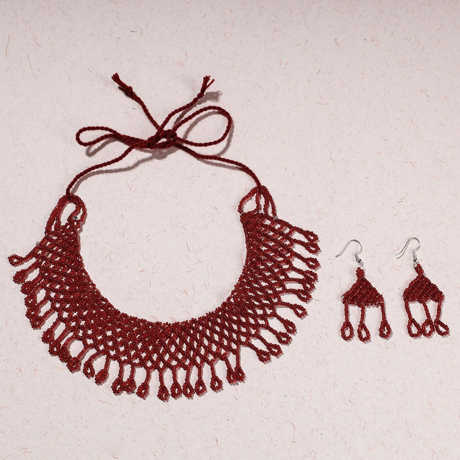 Intricately crafted red handmade thread & beadwork jali necklace set using glass & ceramic beads with cotton yarn. Exclusive beadwork jewelry in vibrant colours for a versatile appeal.