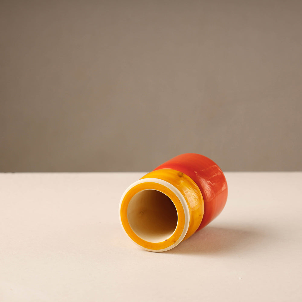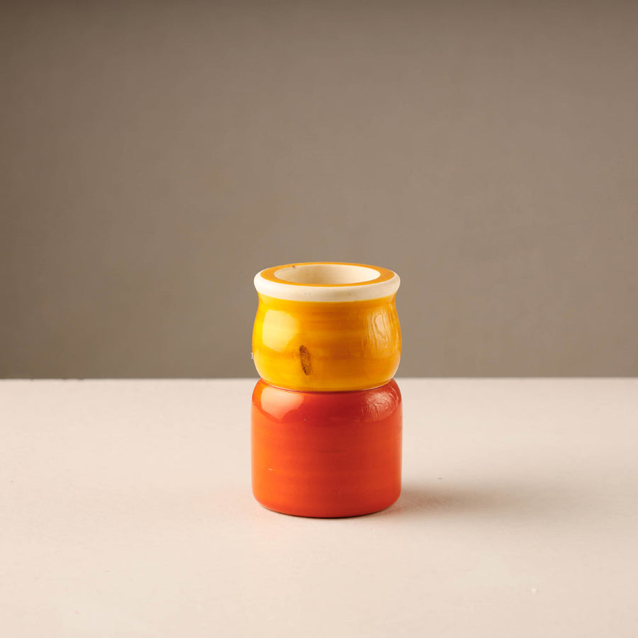 Handmade traditional channapatna wooden jar from Andhra Pradesh. This jar is hand painted with natural dyes. Colors are obtained naturally Yellow colour from turmeric, Red colour kum-kum base, Green colour vegetable leaf dye, Orange colour from Saffron dye. This product is a lacware craft which is made of lac, a naturally available resin. It is non-toxic and chemical free and safe for children. Good play item for kids and nice for gifting or house decoration.