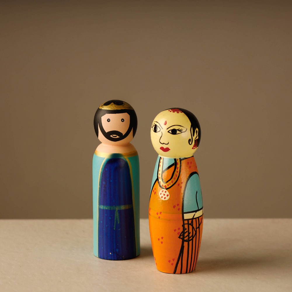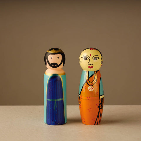 Channapatna toys are a particular form of wooden toys (and dolls) that are manufactured in the town of Channapatna in the Ramanagara district of Karnataka state, India. As a result of the popularity of these toys, Channapatna is known as Gombegala Ooru (toy-town) of Karnataka. The craft has diversified over time, For nearly two centuries, ivory-wood was the main wood used in the making of these toys, though rosewood and sandalwood were also occasionally used. other woods - including rubber, sycamore, cedar, pine and teak are now used as well. Manufacturing stages include procuring the wood, seasoning the wood, cutting the wood into the desired shapes, pruning and carving the toys, applying the colours and finally polishing the finished product. Vegetable dyes are used in the colouring process to ensure that the toys and dolls are safe for use by children.