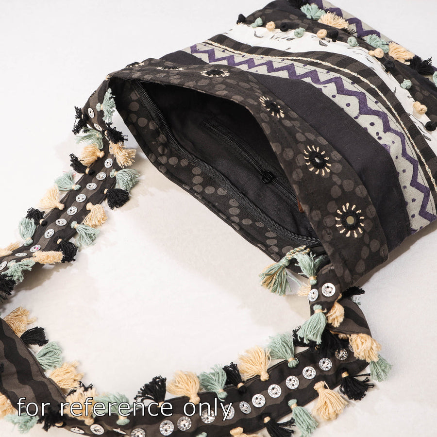 Black handcrafted shoulder bag with tassels made from cotton fabric. It has one zipper pocket inside with intricate mirror work embroidery & cotton fabric lining inside. Ample space to keep most of your essentials.