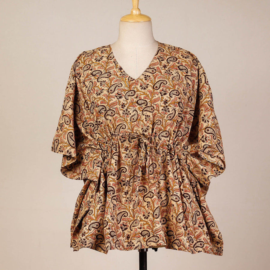 Fine quality beige kalamkari block print cotton kaftan. Kalamkari is the earliest and more complex techniques of block-printing. Showcasing an assortment of hand block printed motifs inspired by traditional kalamkari painting. A traditional kaftan or caftan is an ankle-length garment with long, flowing sleeves. It has an adjustable drawstring waist. These loose-fitting cotton kaftans are enhanced by a soft touch and beautiful hand prints. This dress will allow you to move with ease and comfort. The drawstring waist tie will give you the freedom to customize the fit to suit your unique shape.