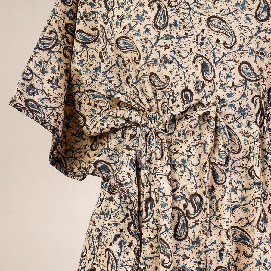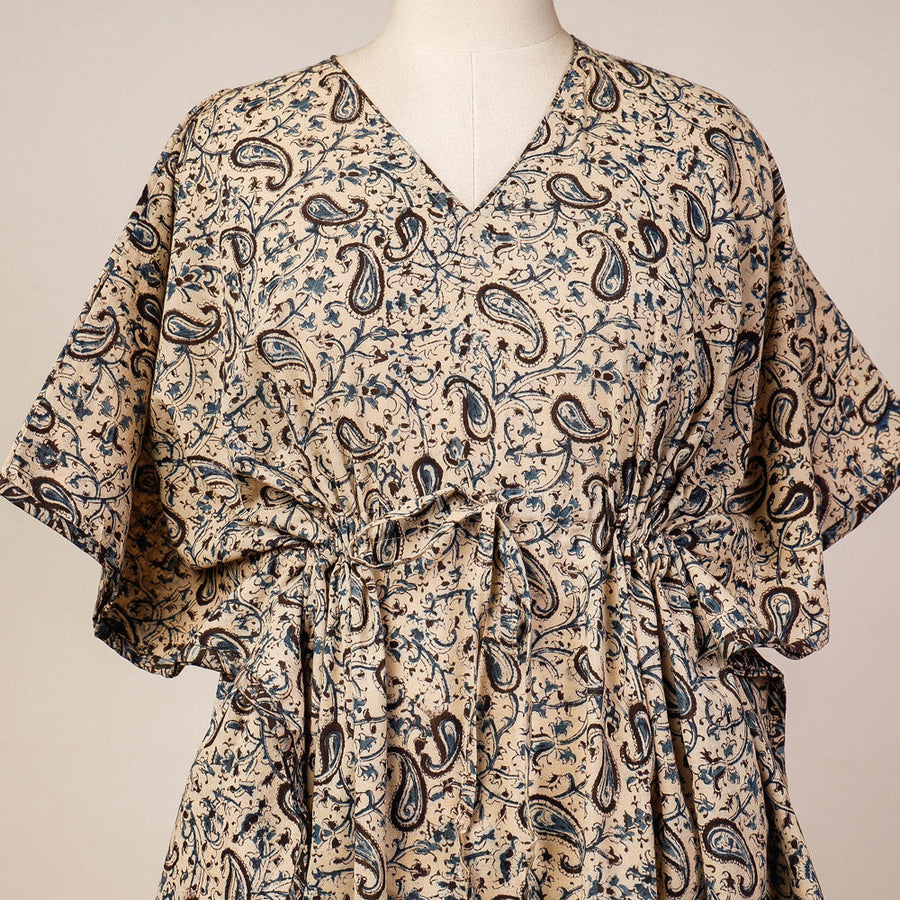 Fine quality beige kalamkari block print cotton kaftan. Kalamkari is the earliest and more complex techniques of block-printing. Showcasing an assortment of hand block printed motifs inspired by traditional kalamkari painting. A traditional kaftan or caftan is an ankle-length garment with long, flowing sleeves. It has an adjustable drawstring waist. These loose-fitting cotton kaftans are enhanced by a soft touch and beautiful hand prints. This dress will allow you to move with ease and comfort. The drawstring waist tie will give you the freedom to customize the fit to suit your unique shape.