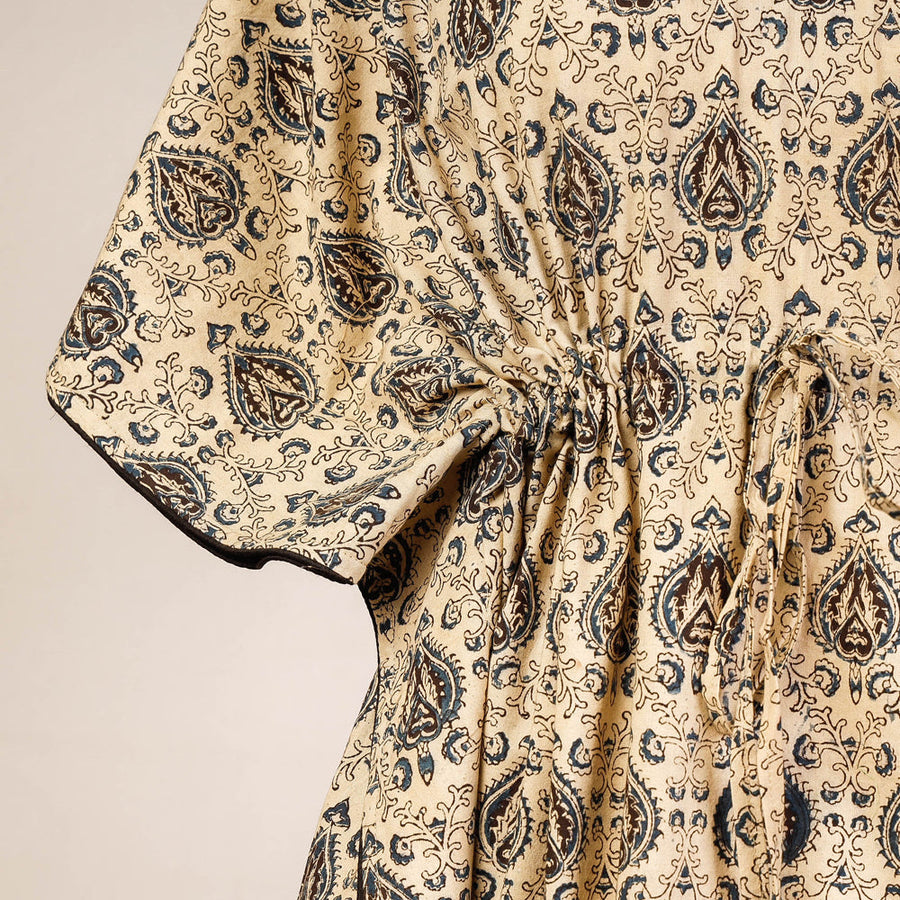 Fine quality beige kalamkari block print cotton kaftan. Kalamkari is the earliest and more complex techniques of block-printing. Showcasing an assortment of hand block printed motifs inspired by traditional kalamkari painting. A traditional kaftan or caftan is an ankle-length garment with long, flowing sleeves. It has an adjustable drawstring waist. These loose-fitting cotton kaftans are enhanced by a soft touch and beautiful hand prints. This dress will allow you to move with ease and comfort. The drawstring waist tie will give you the freedom to customize the fit to suit your unique shape.